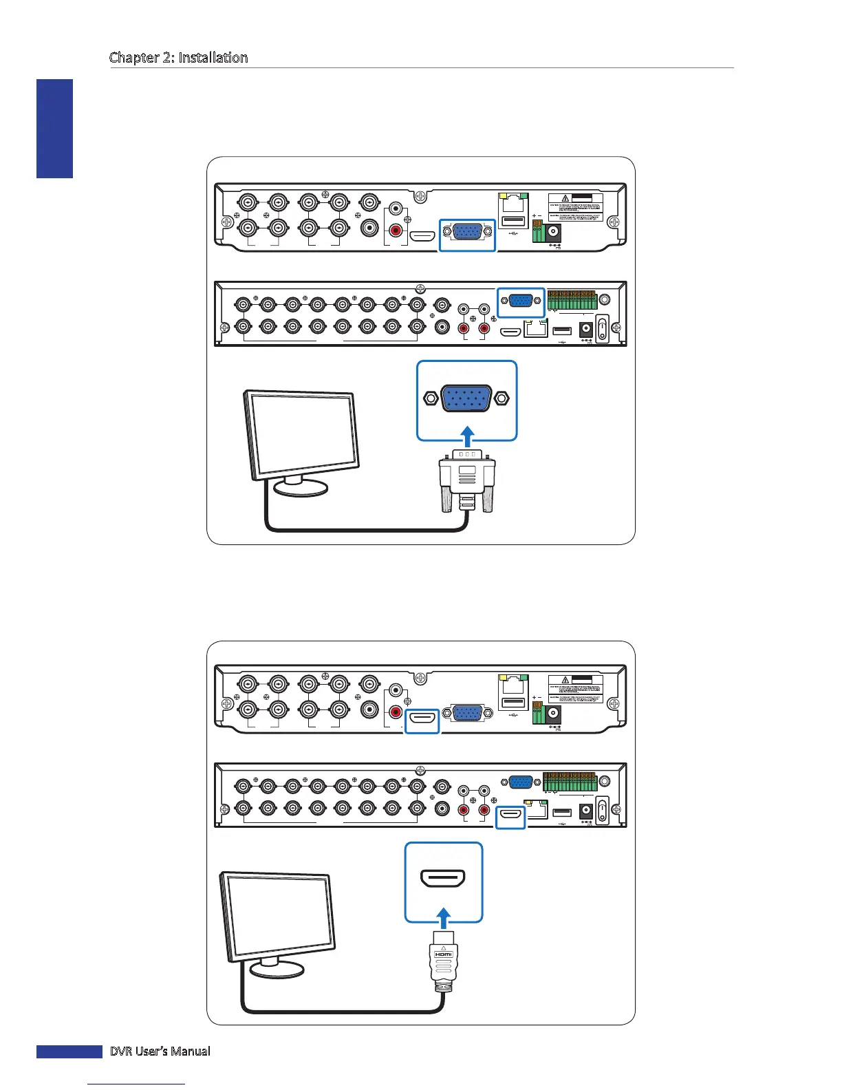 Connect the video output of the DVR to the monitor via HDMI connector as shown.