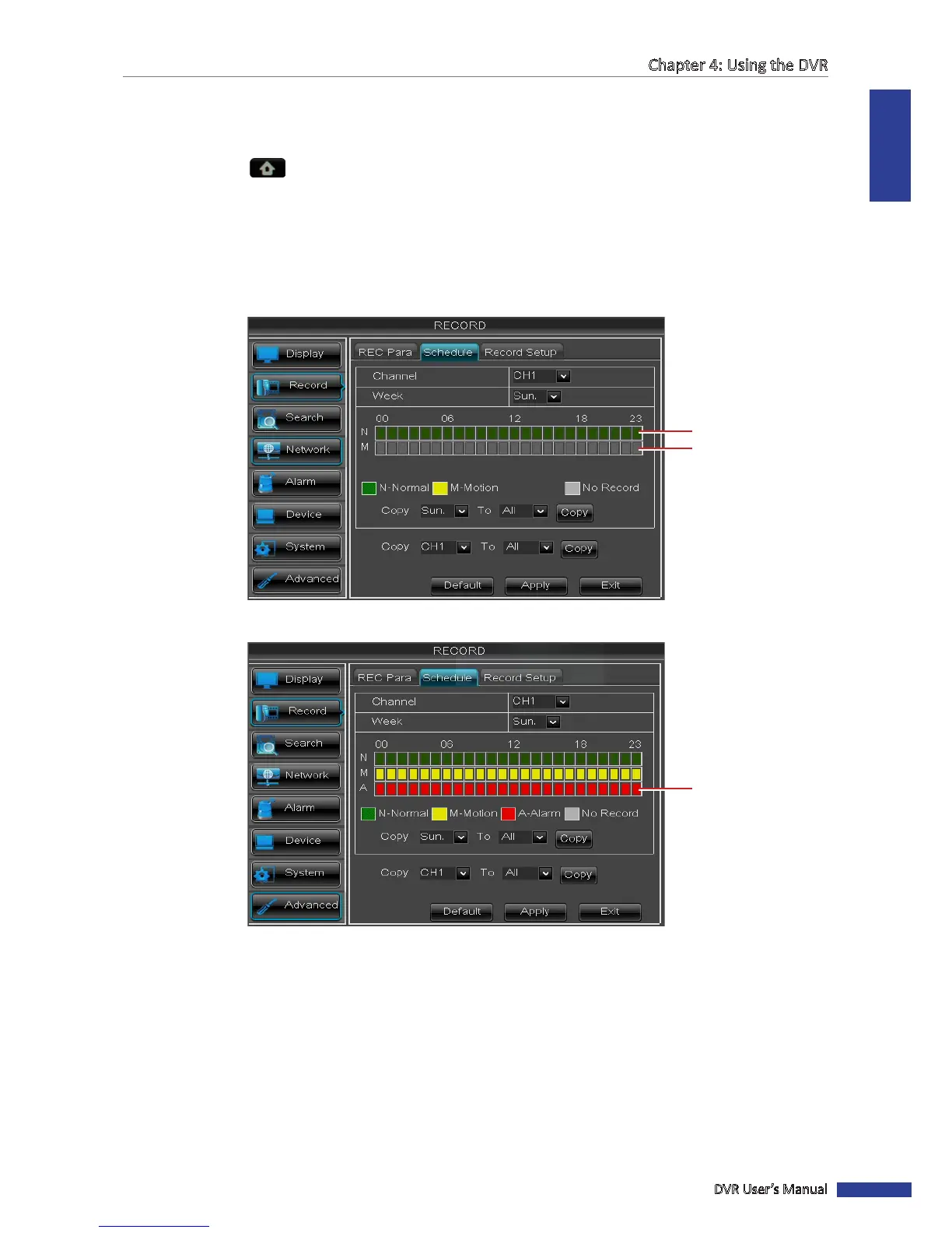 • Alarm Recording (for 16-channel only): When the me slot is marked red, the channel records only when the