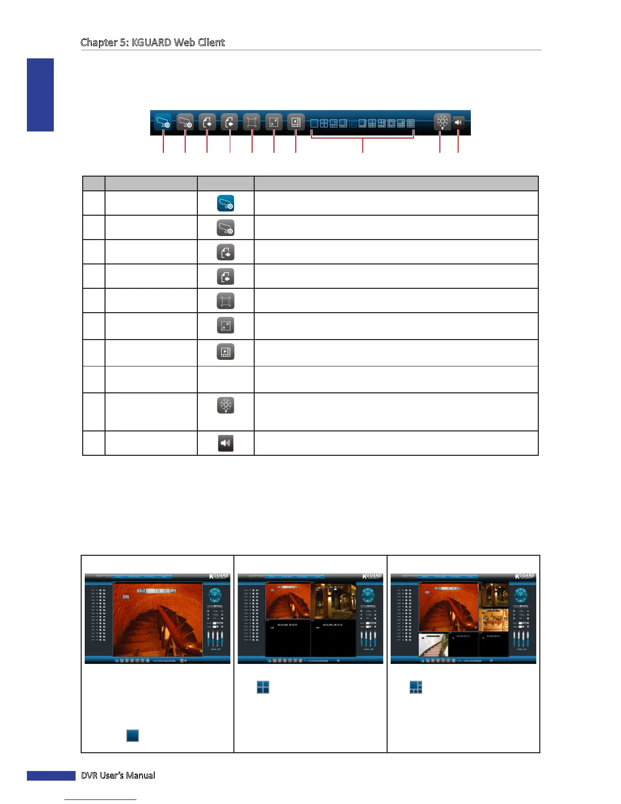 The Live screen can be viewed in dierent modes: 1-channel, 4-channel grid, 6-channel grid, 8-channel grid, 9-channel