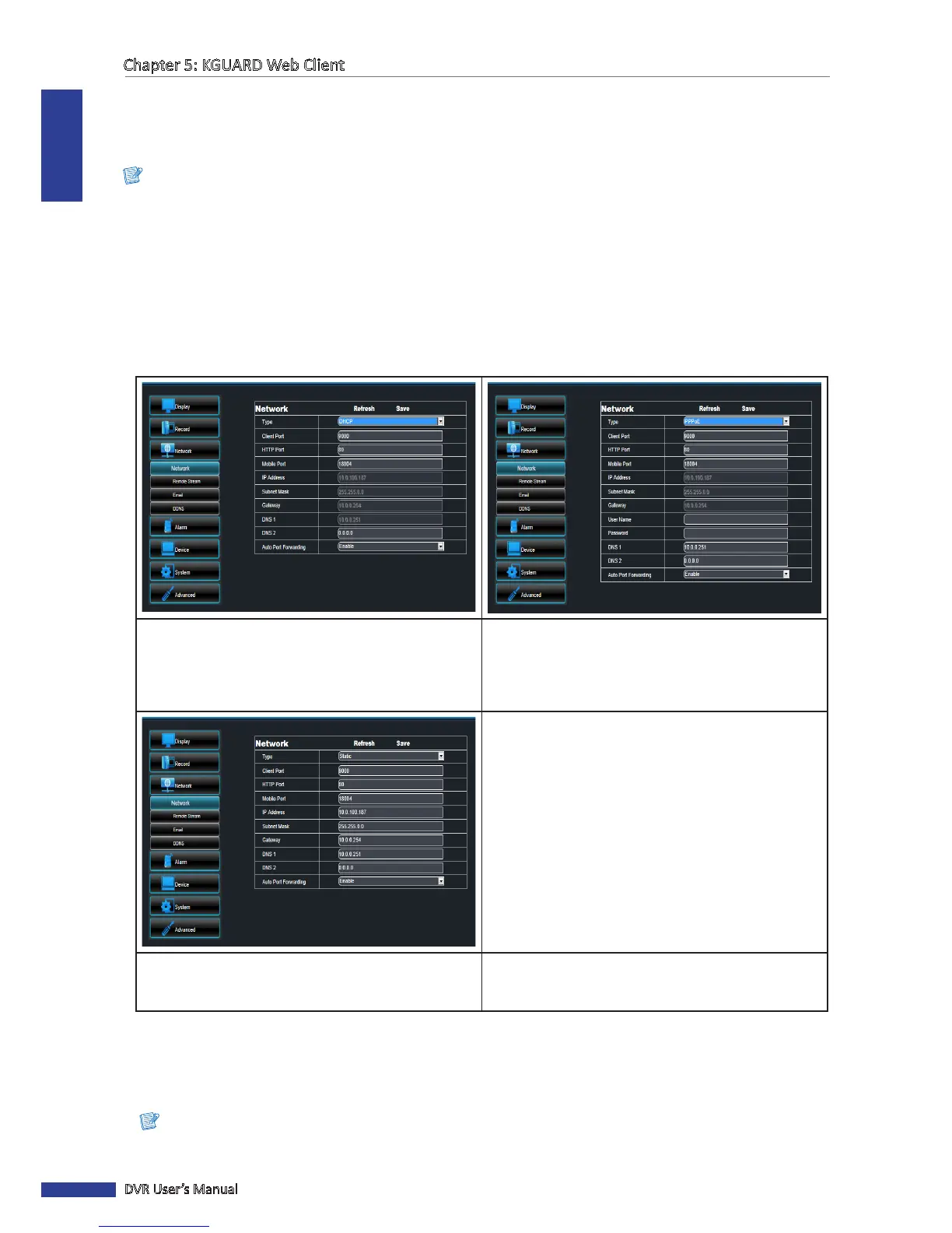 You can use the Network menu to setup how the DVR connects to the network. It provides 3 network connecon
