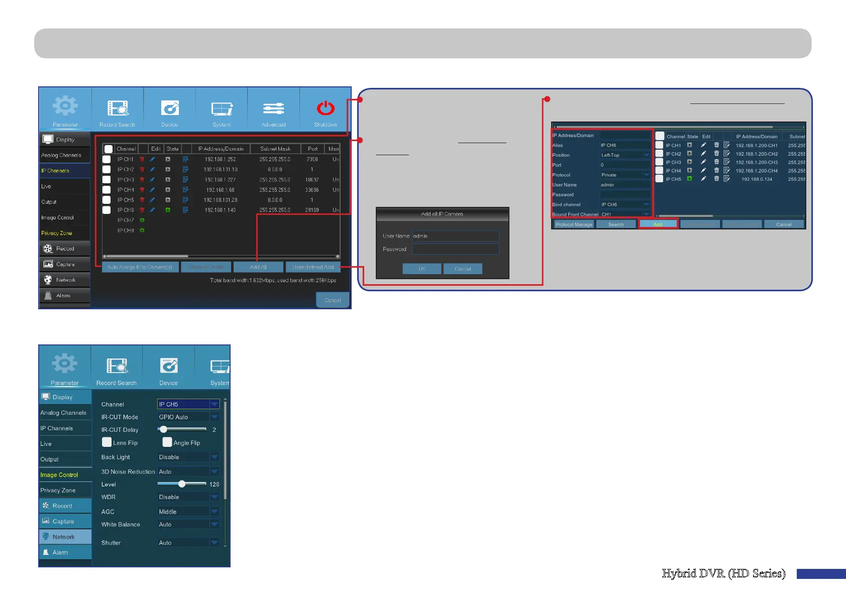 This menu allows you to congure the camera sengs. Some IP cameras may not support this feature and the IP camera sengs cannot also be changed using the DVR.