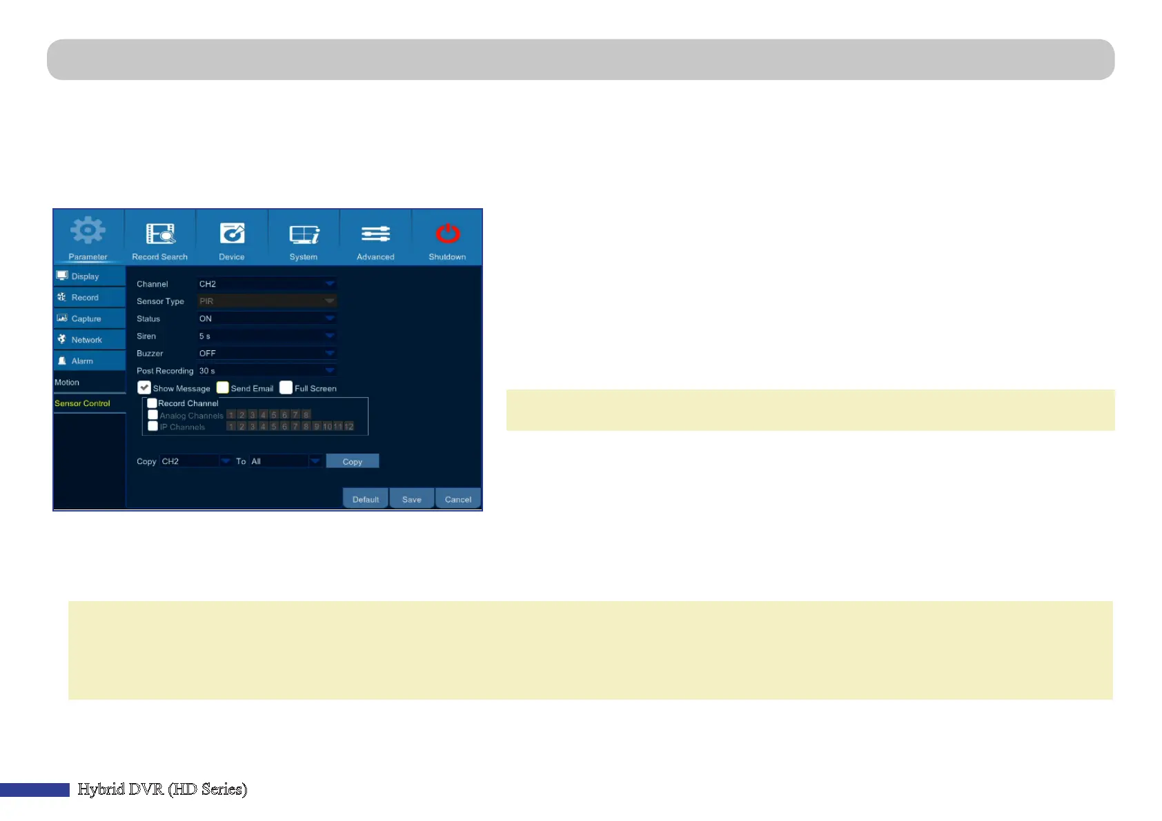 • Post Recording: You can set how long aer the PIR camera is triggered that the DVR will connue