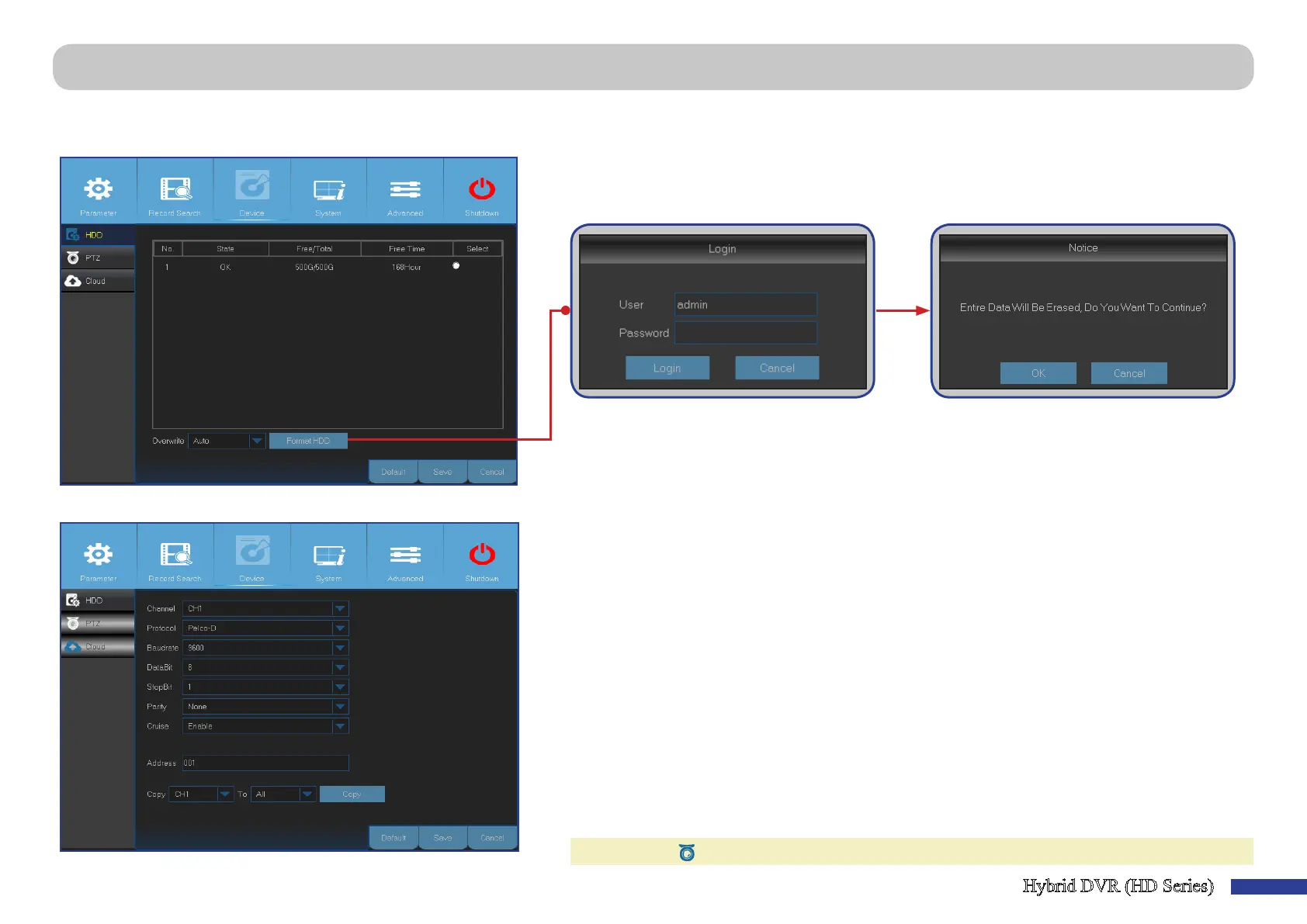 • Baudrate: The speed of the informaon sent from the DVR to the PTZ-capable camera. Make sure