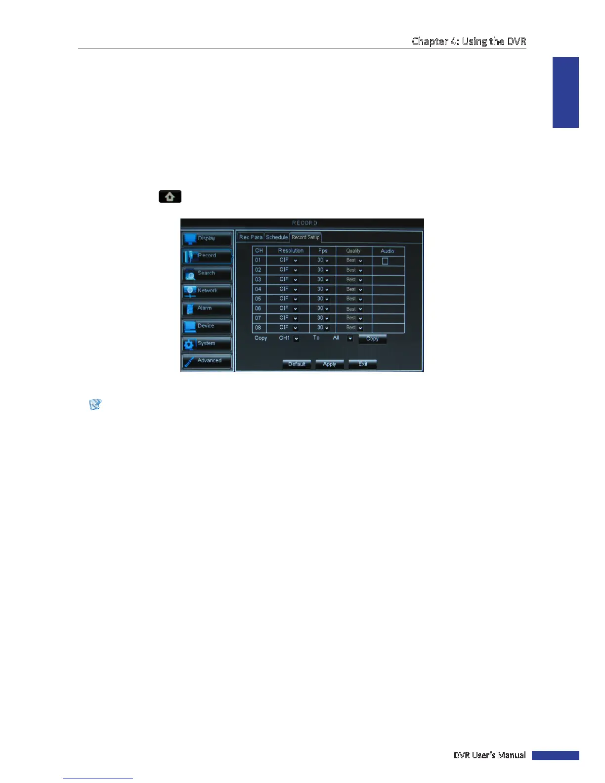 To copy the record setup seng to other channels, select the channel(s) in Copy To, then click Copy.