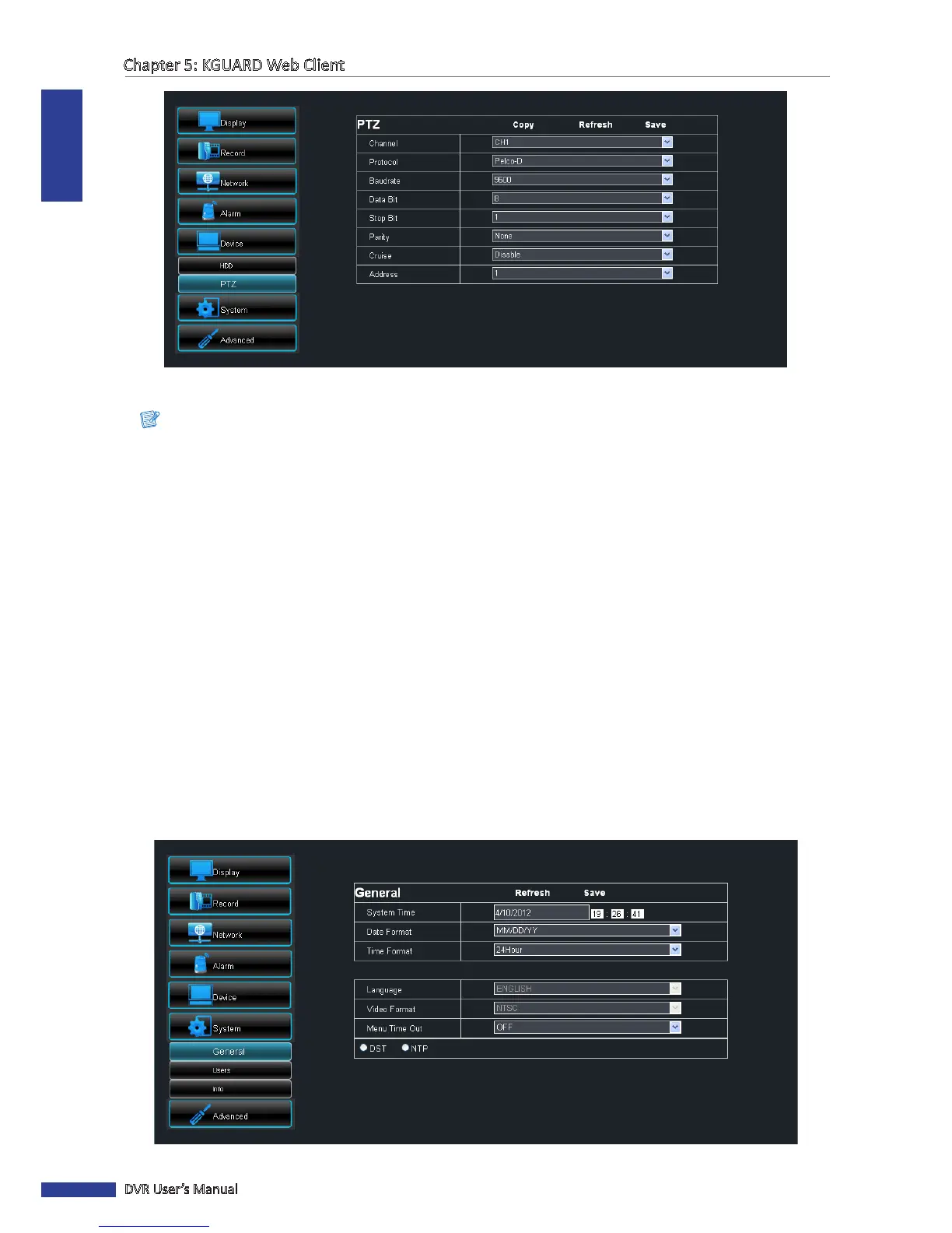 On the System Setup menu, you can modify the me zone and view the language used on the DVR and its signal