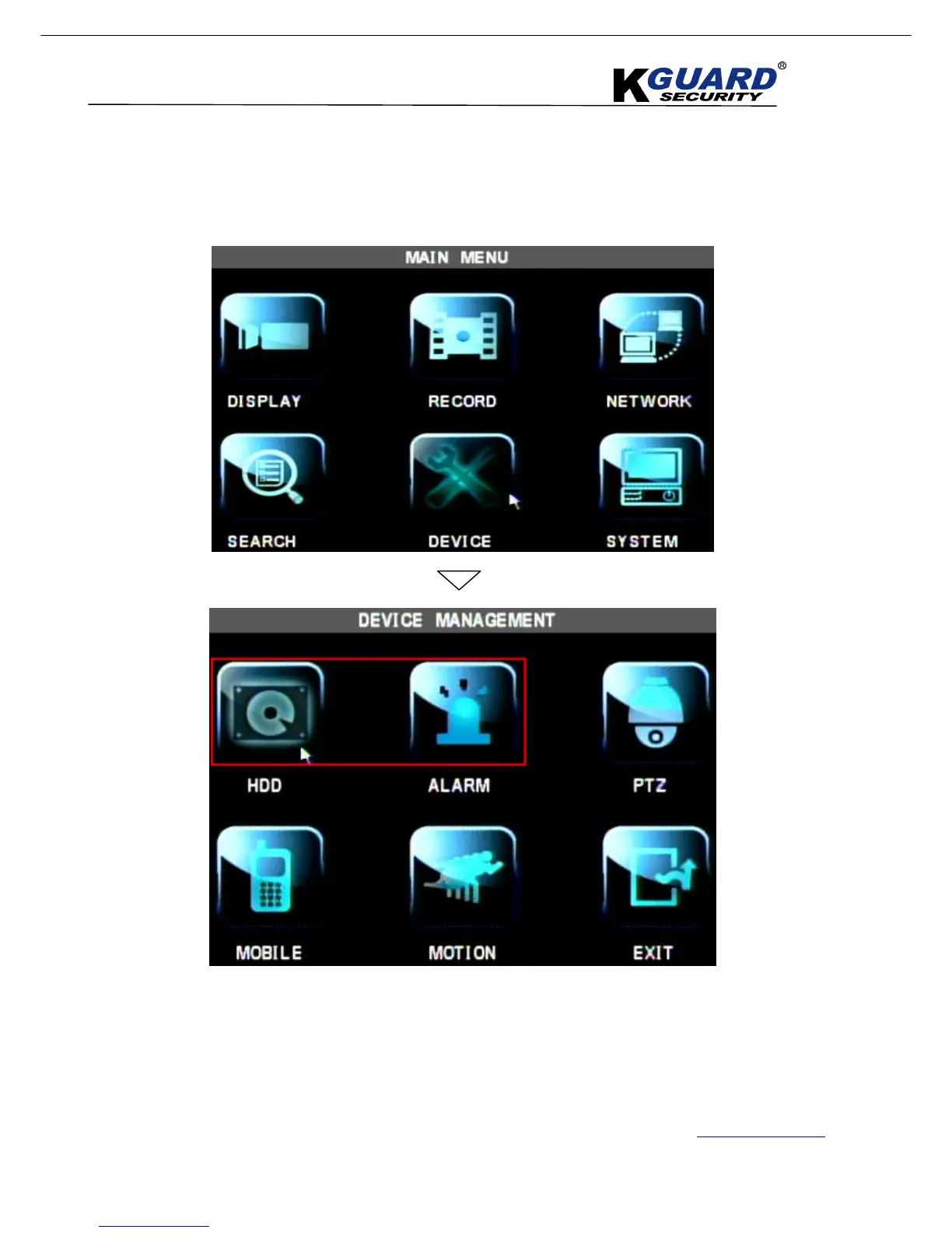 KGuard Security SHA-104.V2 - Main Menu Setup (Device Management); ALARM Setup