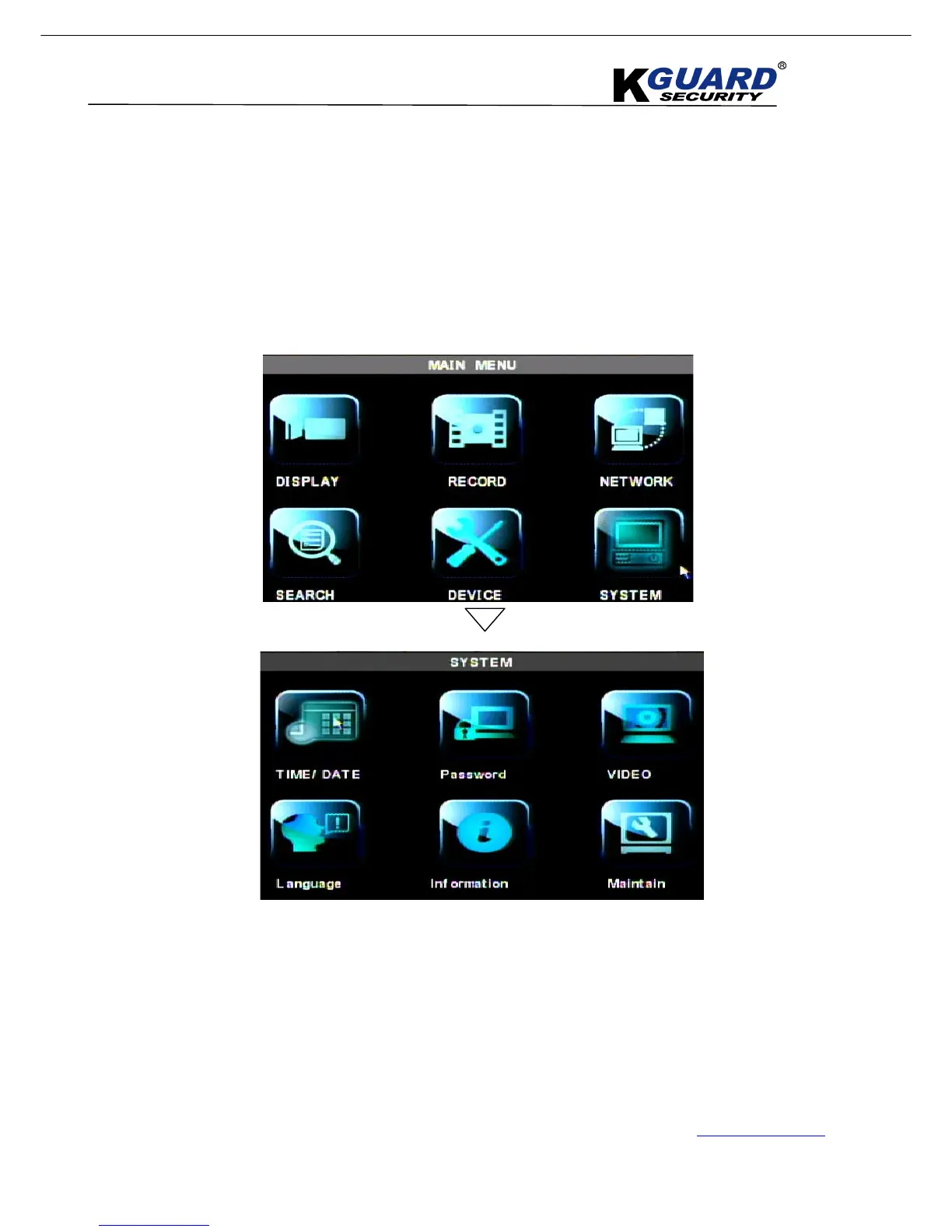 【System/Privacy Zone/Time/Password/Video/Language/Maintain】