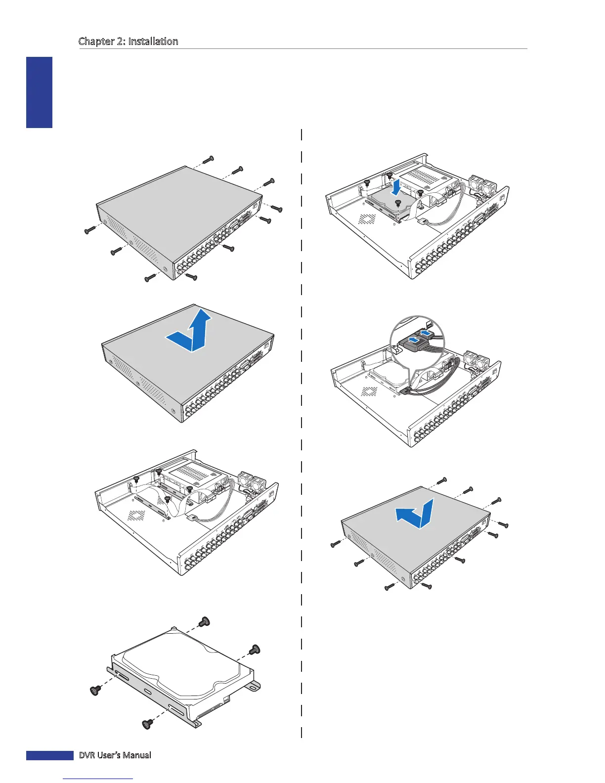 The 16-channel DVR supports up to two 3.5” SATA hard disk drives. The HDDs can be installed in the internal HDD slot