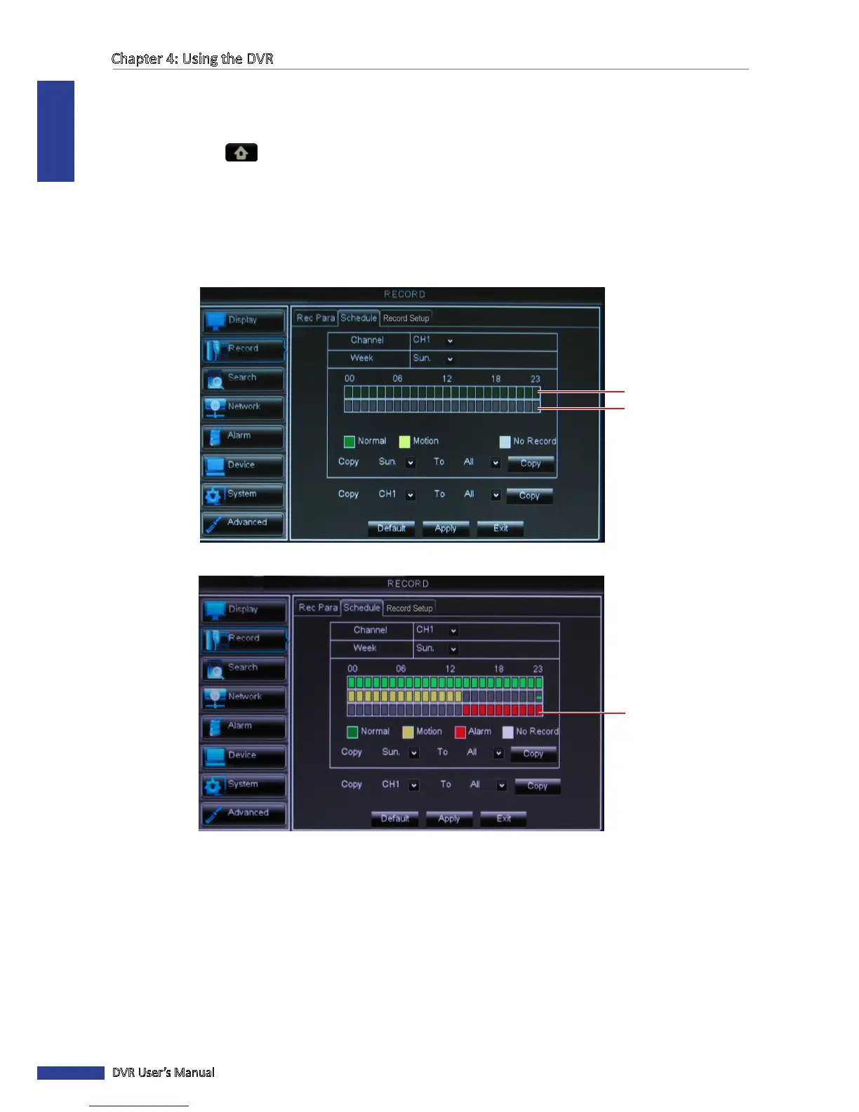 • Alarm Recording (for 16-channel only): When the me slot is marked red, the channel records only when the