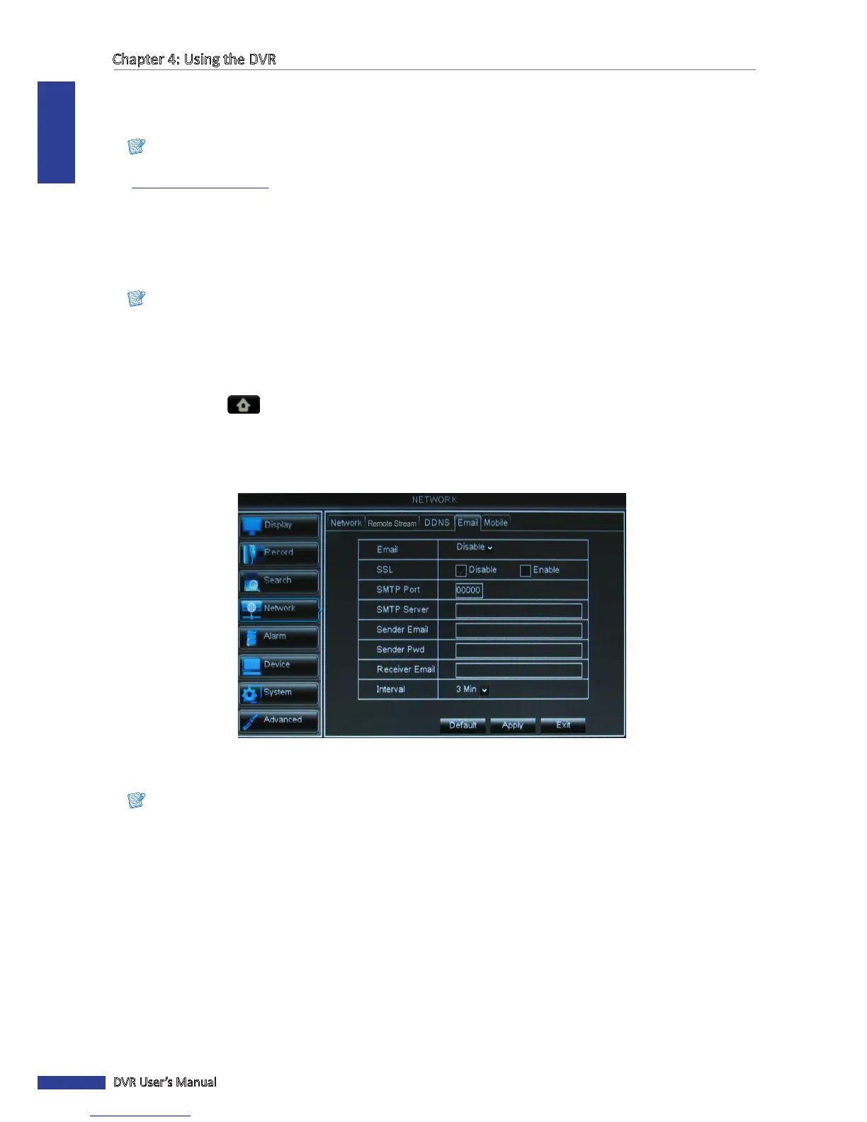 Be sure that the DVR network connecon is properly congured before proceeding with the email setup.