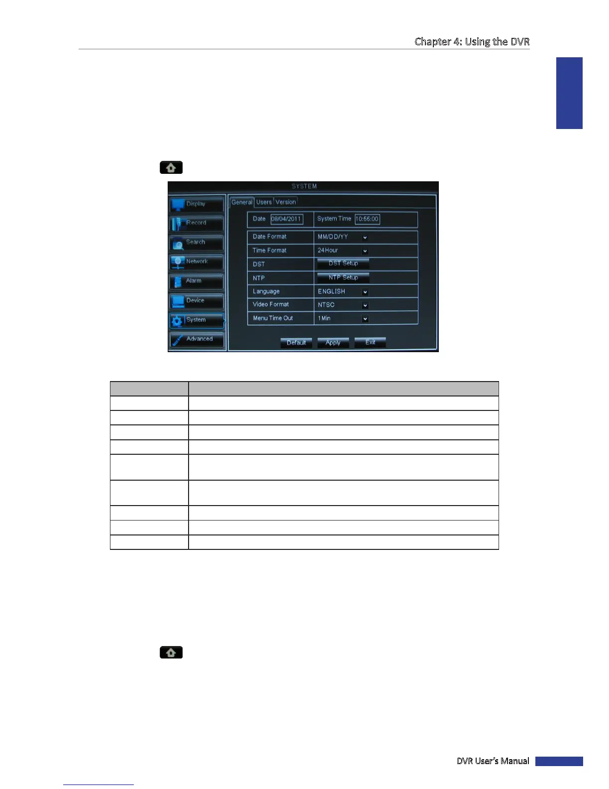 On the SYSTEM menu, you can congure the date and me, user and password, video output, on screen display