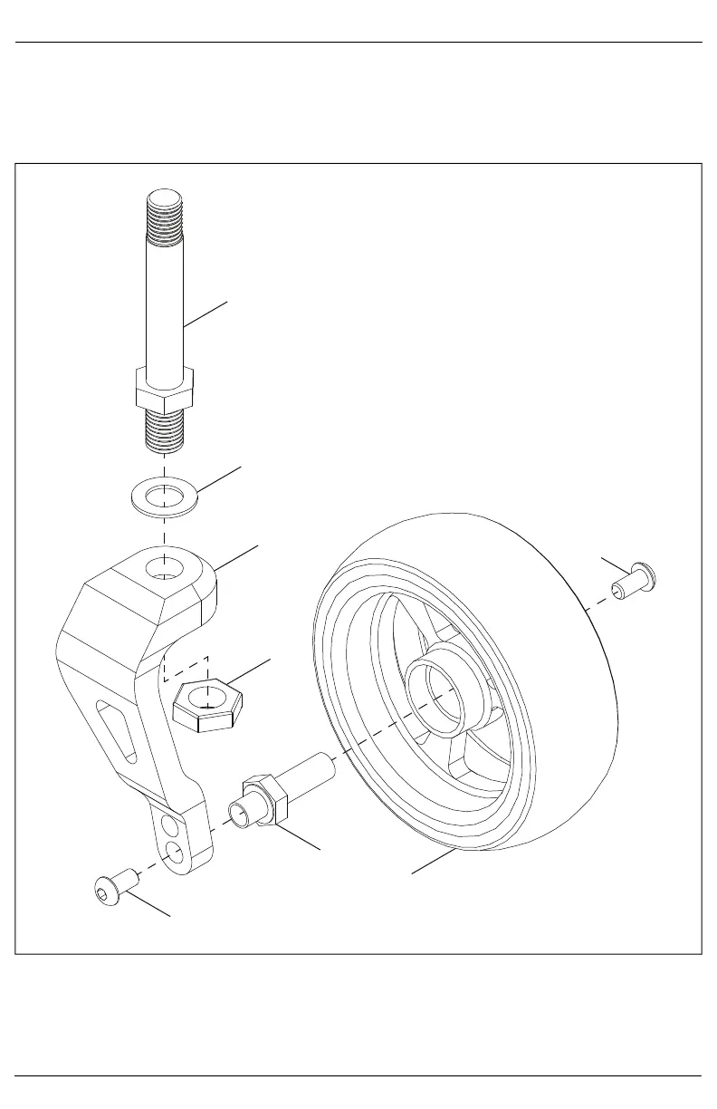 2. Install caster wheel (G) onto fork (C) with two screws (E) and the axle shaft (F).