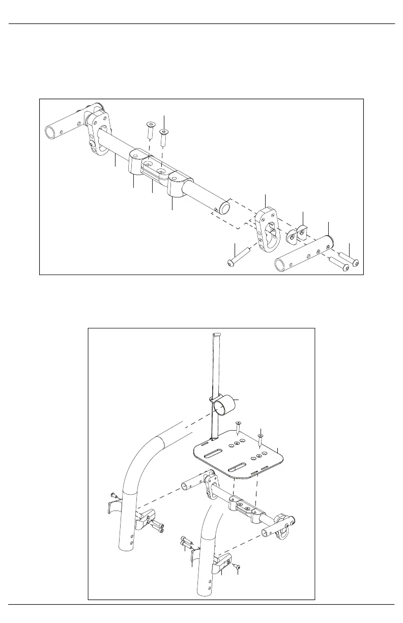 5. Install the top and bottom footplate clamps (E & F) onto the footrest tubes and the frame tubes with