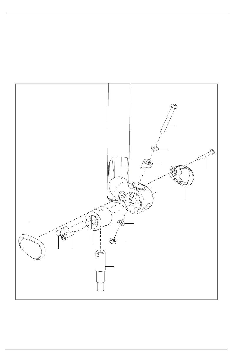 4. Install the M6 bolt (I) through the washer (G), caster lock saddle (H), caster housing opening, caster
