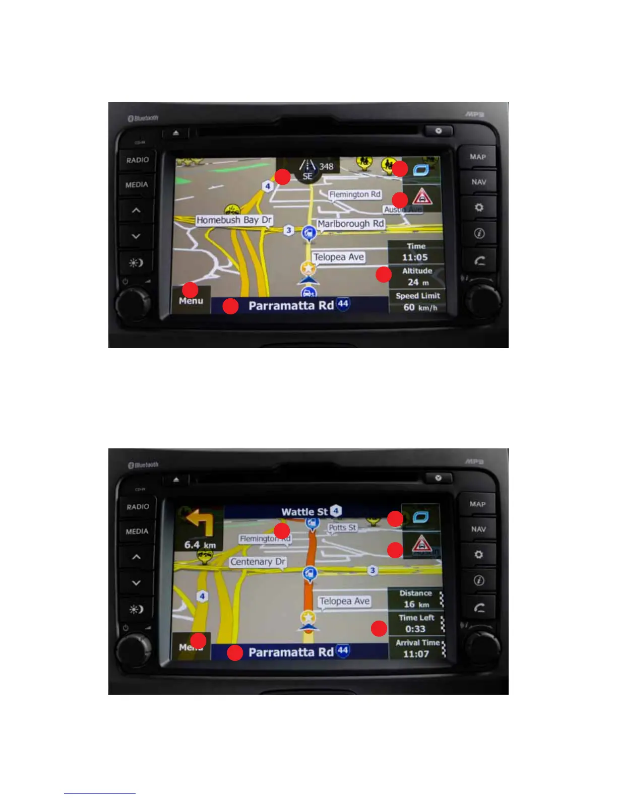 Kia Multimedia - Map Screen (No Destination Set); Map Screen (Destination Selected)