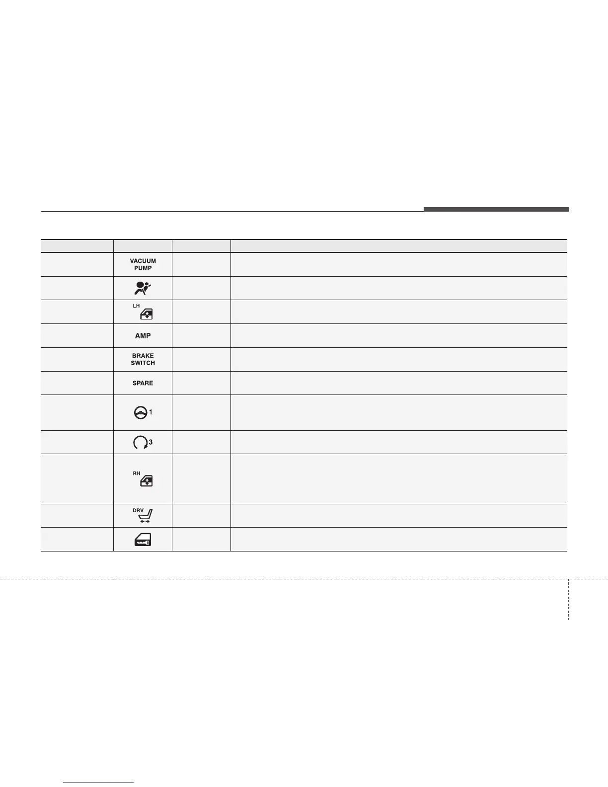 Fuse Name Symbol Fuse rating Protected Component