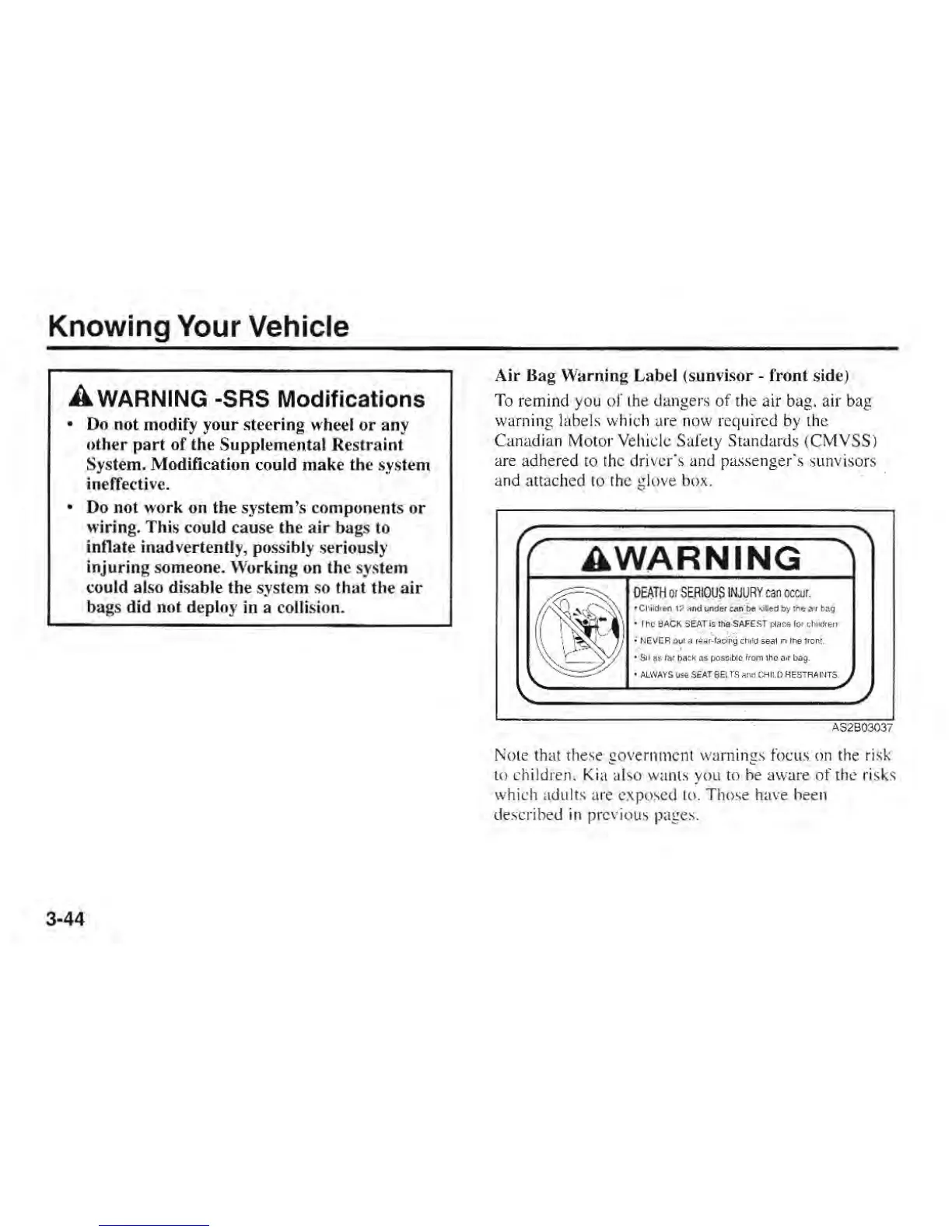 Kia Rio 2001 - Air Bag Warning Label
