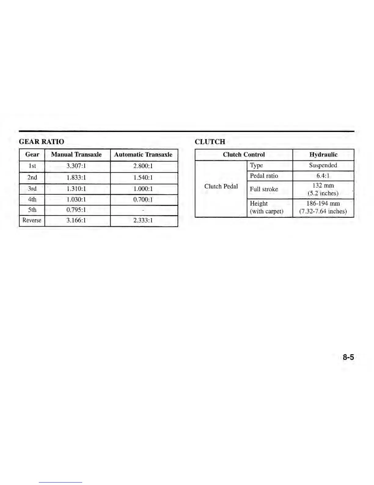 Kia SEPHIA 2000 - Specifications: Gear Ratio, Clutch