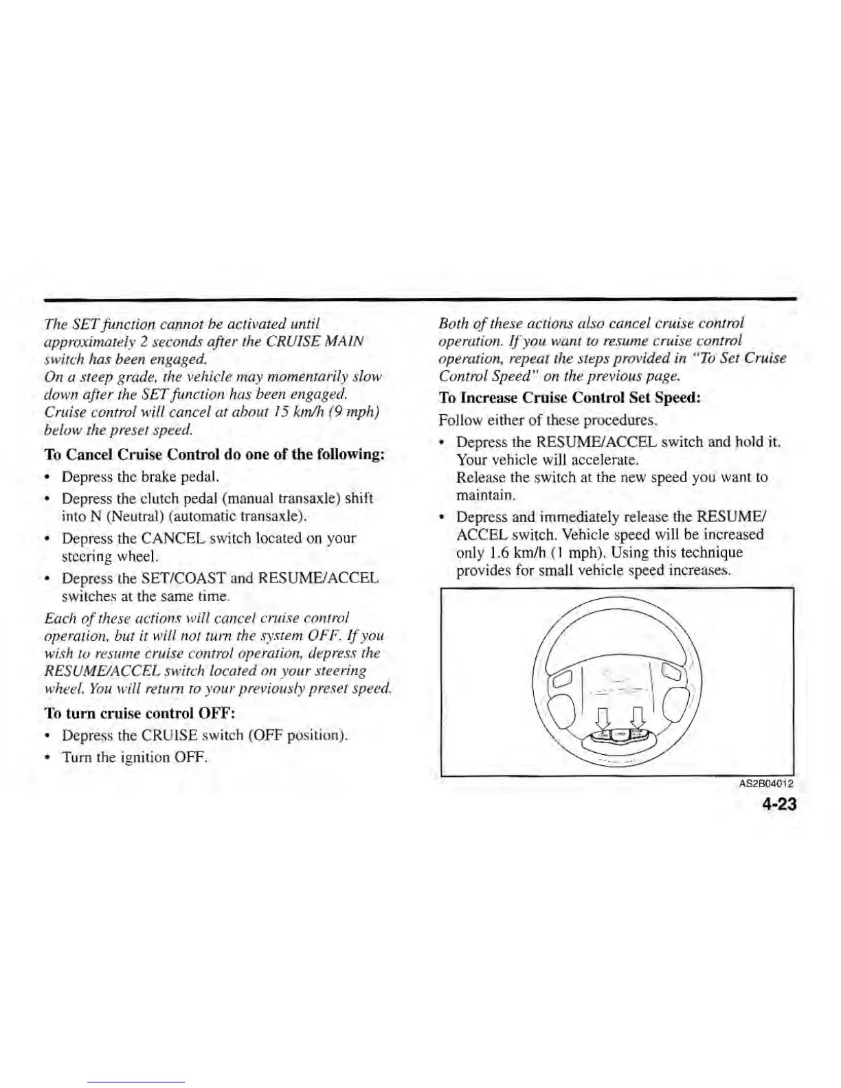 Kia SEPHIA 2000 - To Cancel Cruise Control; To Turn Cruise Control off; To Increase Cruise Control Set Speed