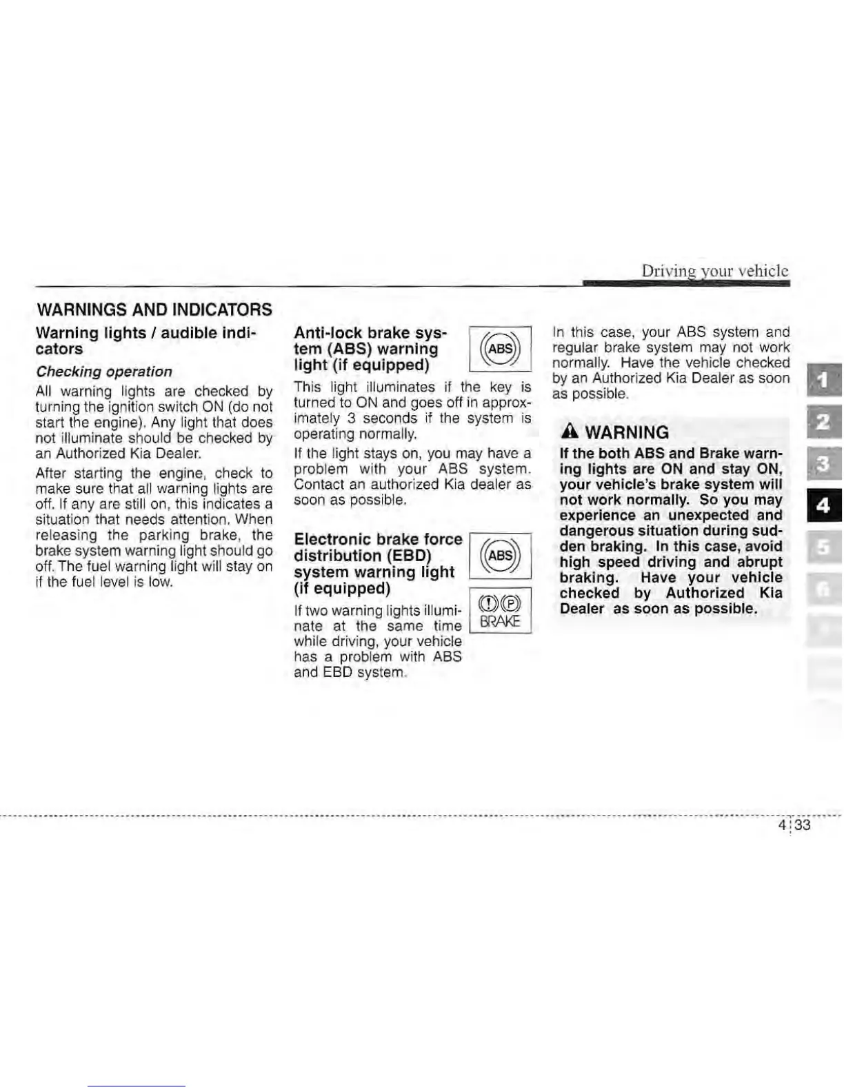 Kia Spectra - Warnings and Indicators; Warning Lights;Audible Indicators; Anti-Lock Brake System Warning Light; Electronic Brake Force Distribution Warning Light