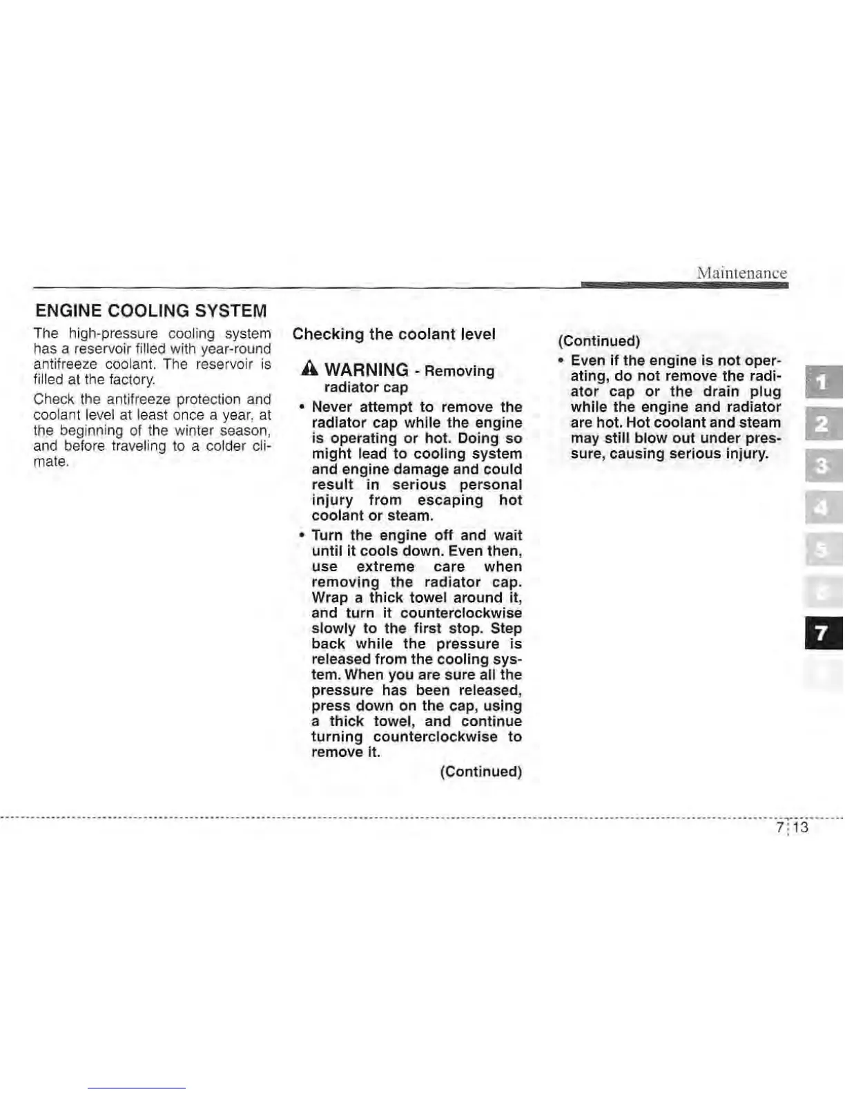 Kia Spectra - Engine Cooling System; Checking the Coolant Level