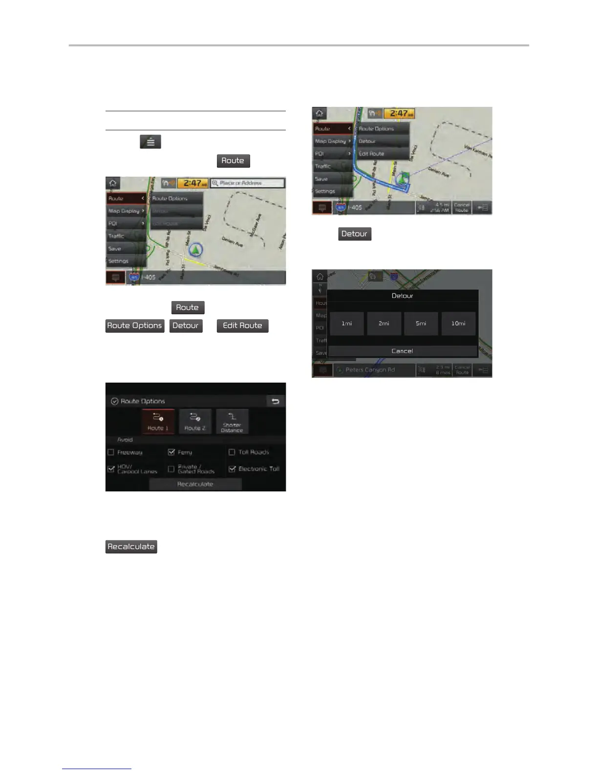 Kia Stinger - Navigation Routes; Route Setting and Options; Quick Menu for Route Management; Detour Functionality