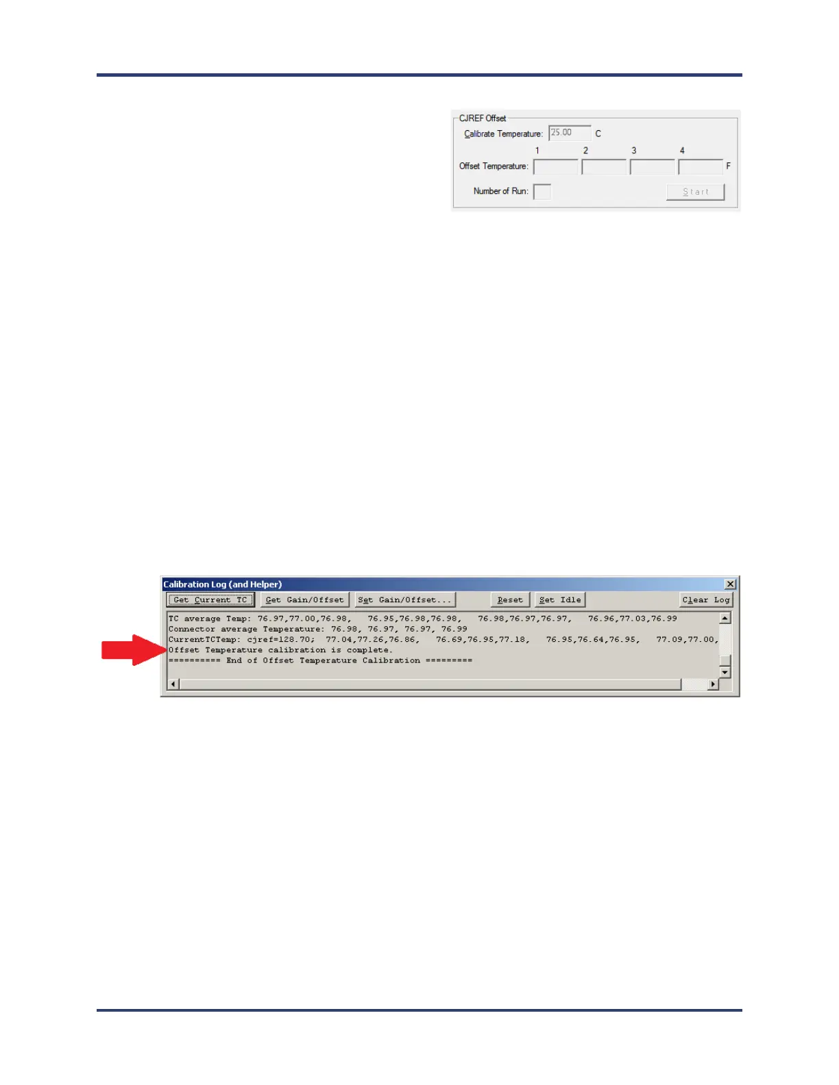 When the software completes the offset calibration, a status messages appears in the Calibration Log area