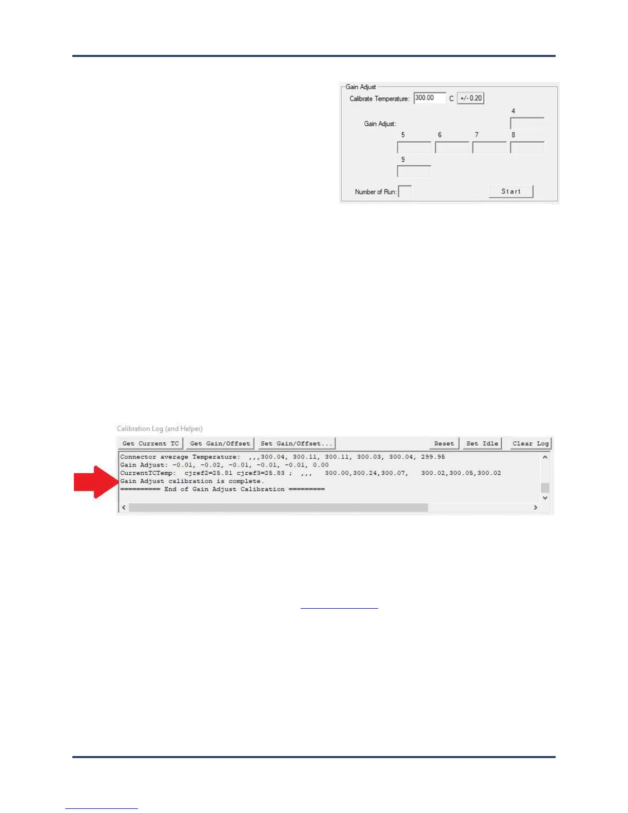 When the software completes the gain adjustment, a status messages appears in the Calibration Log area