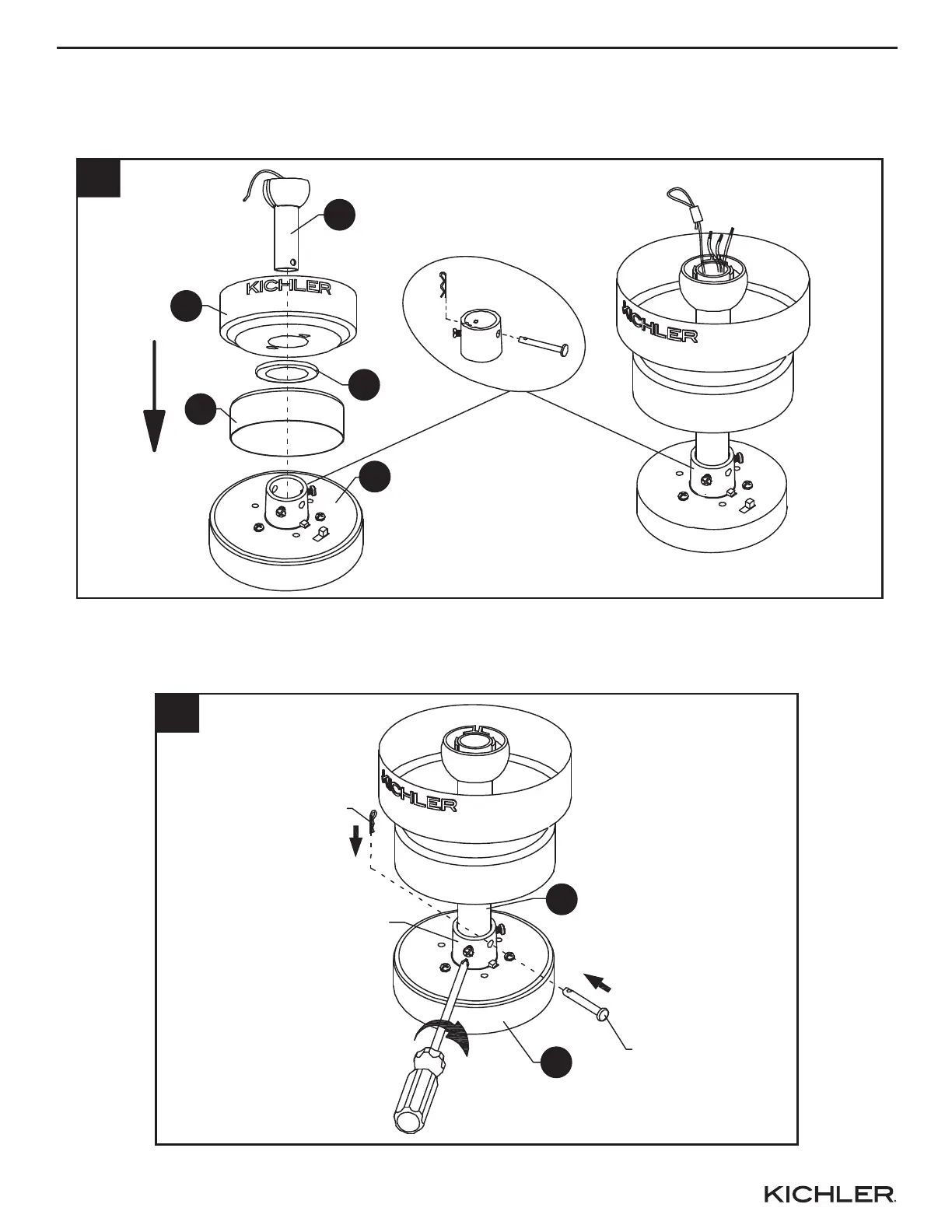 3. Insert down rod (B) through canopy (C), canopy hole cover (I), and motor coupling cover (E).