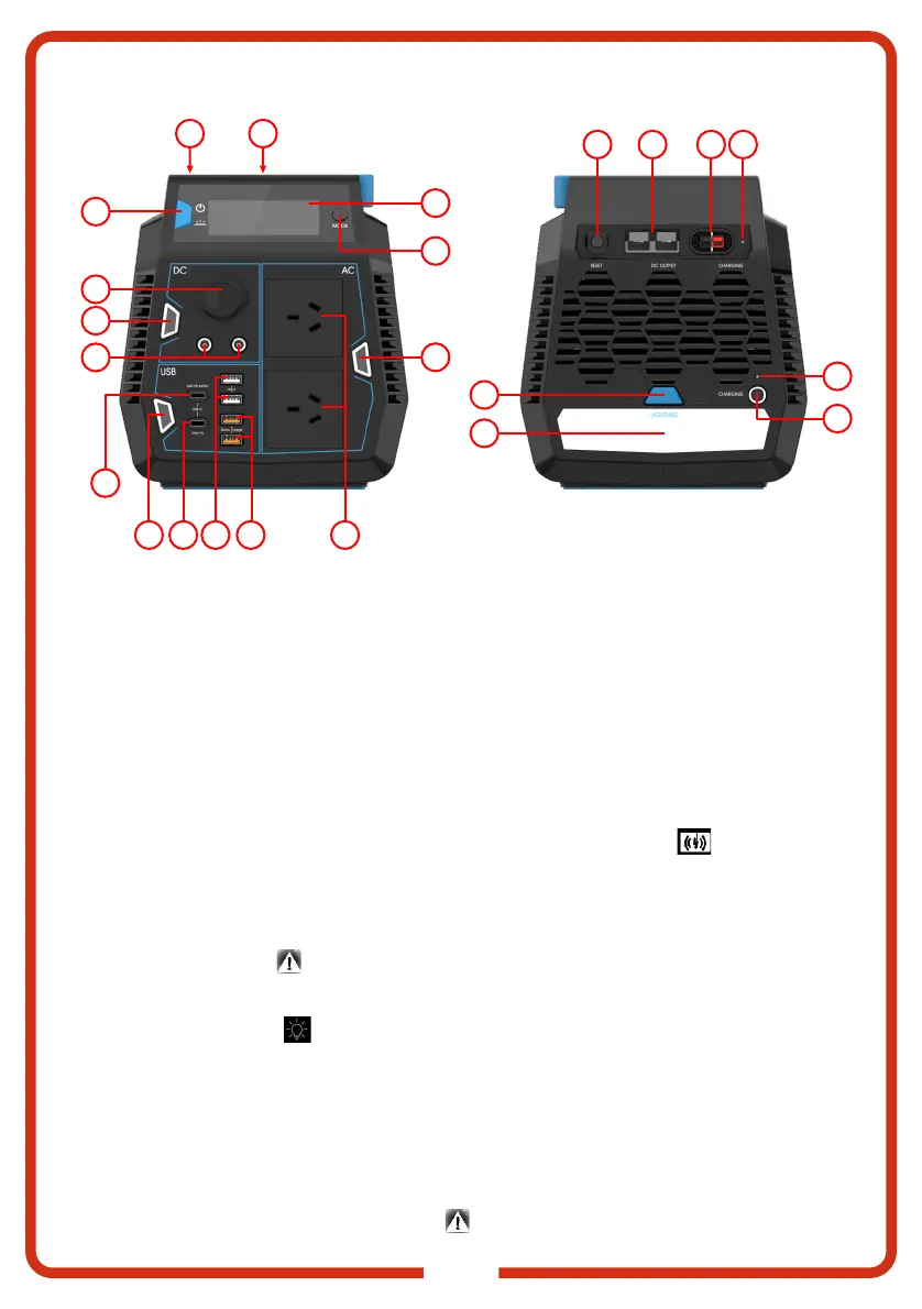 4.DC Button: Controls DC outputs (6mm DC socket, CIG socket, Anderson Socket). When