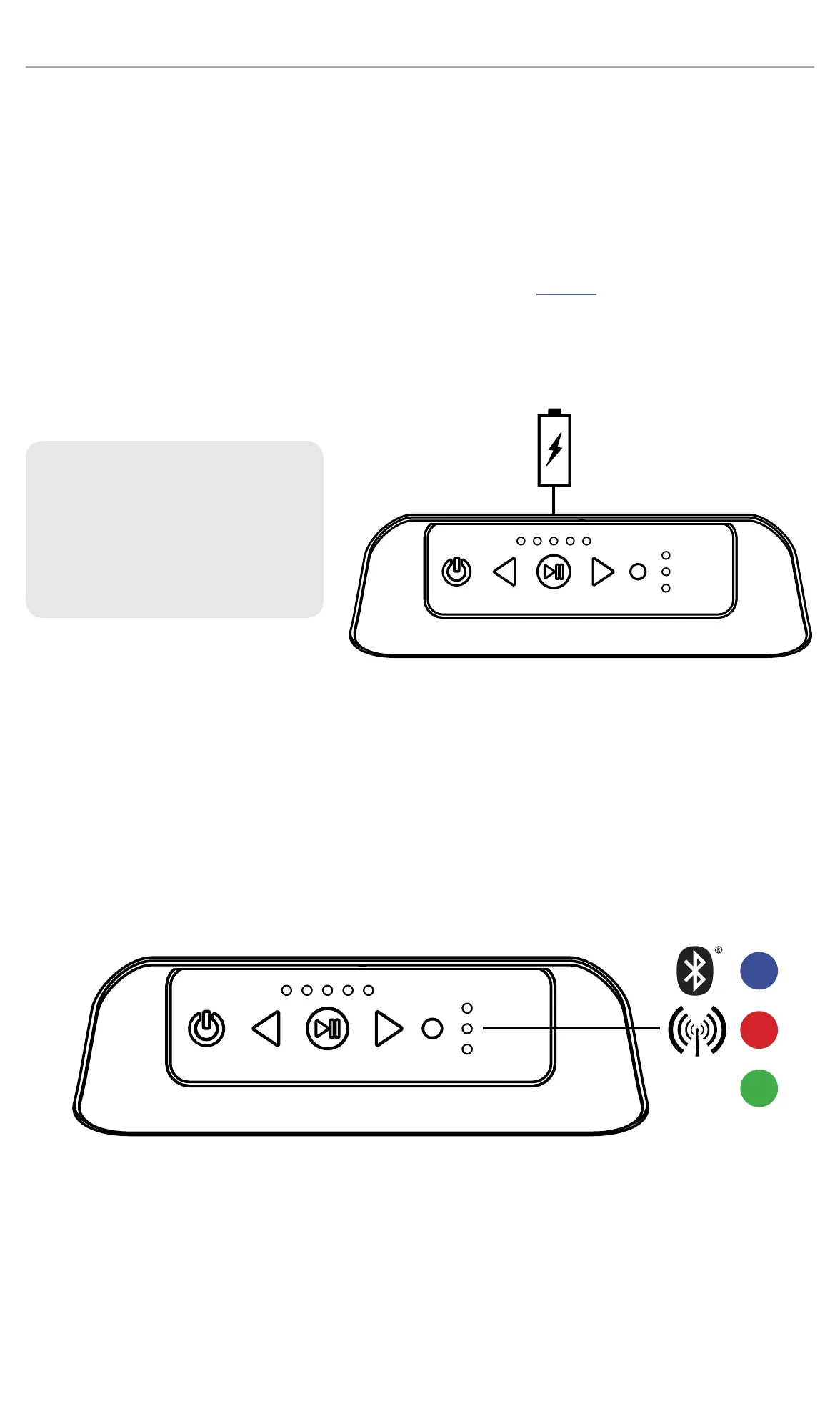 Battery status is indicated with 5 white LEDs on top of the Bullfrog, above the PLAY/PAUSE