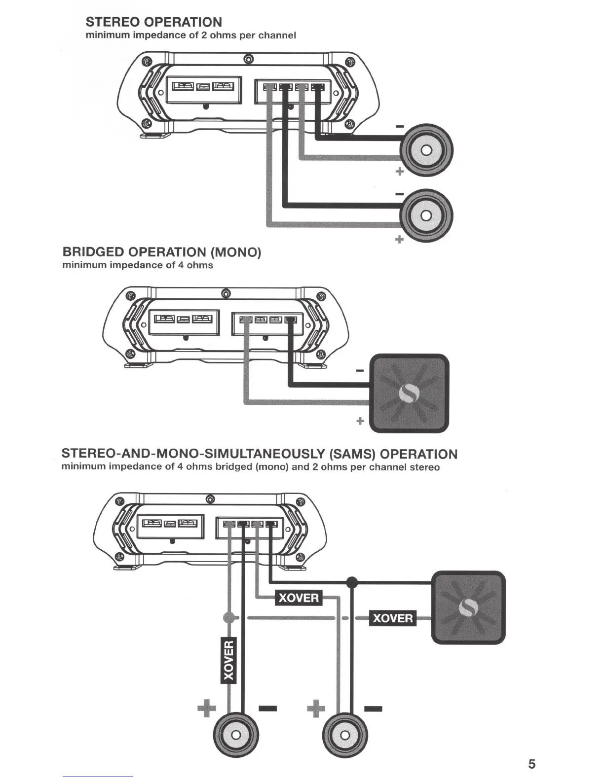 Kicker DXA125.2 - Amplifier Operation Modes; Stereo Speaker Configuration; Mono and Combined Operation Modes