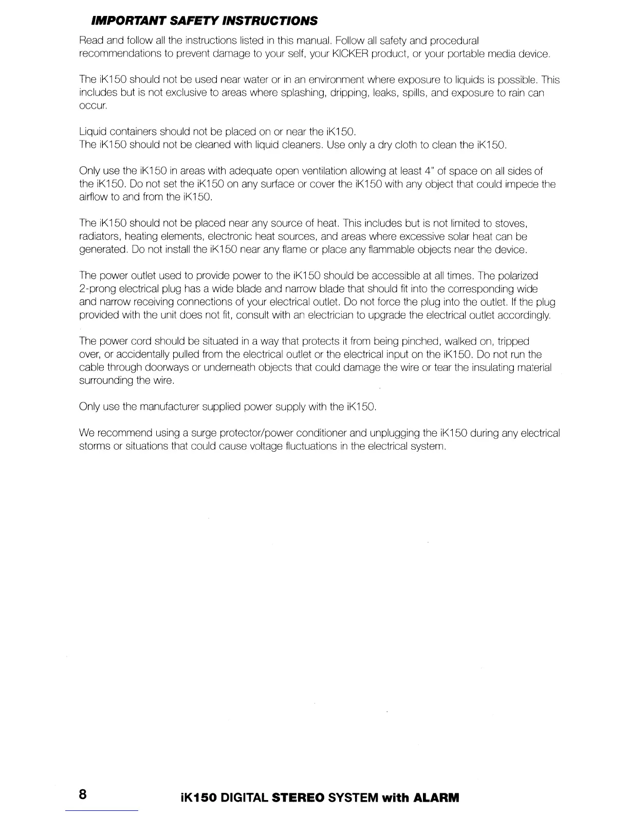 over, or accidentally pulled from the electrical outlet or the electrical input on the iK150. Do not