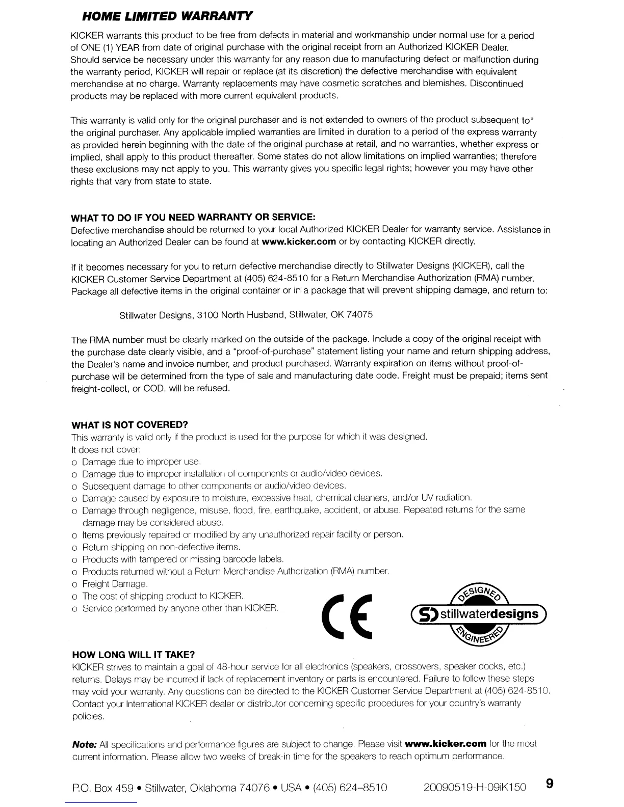 If it becomes necessary for you to return defective merchandise directly to Stillwater Designs (KICKER), call the