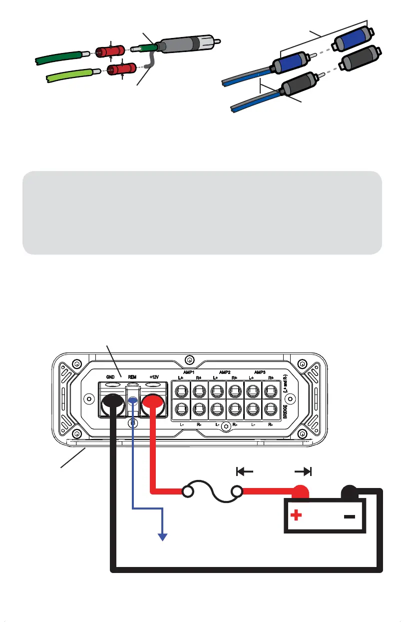 Install a fuse within 7” (18cm) of the battery and in-line with the power cable connected to your amplifi er.