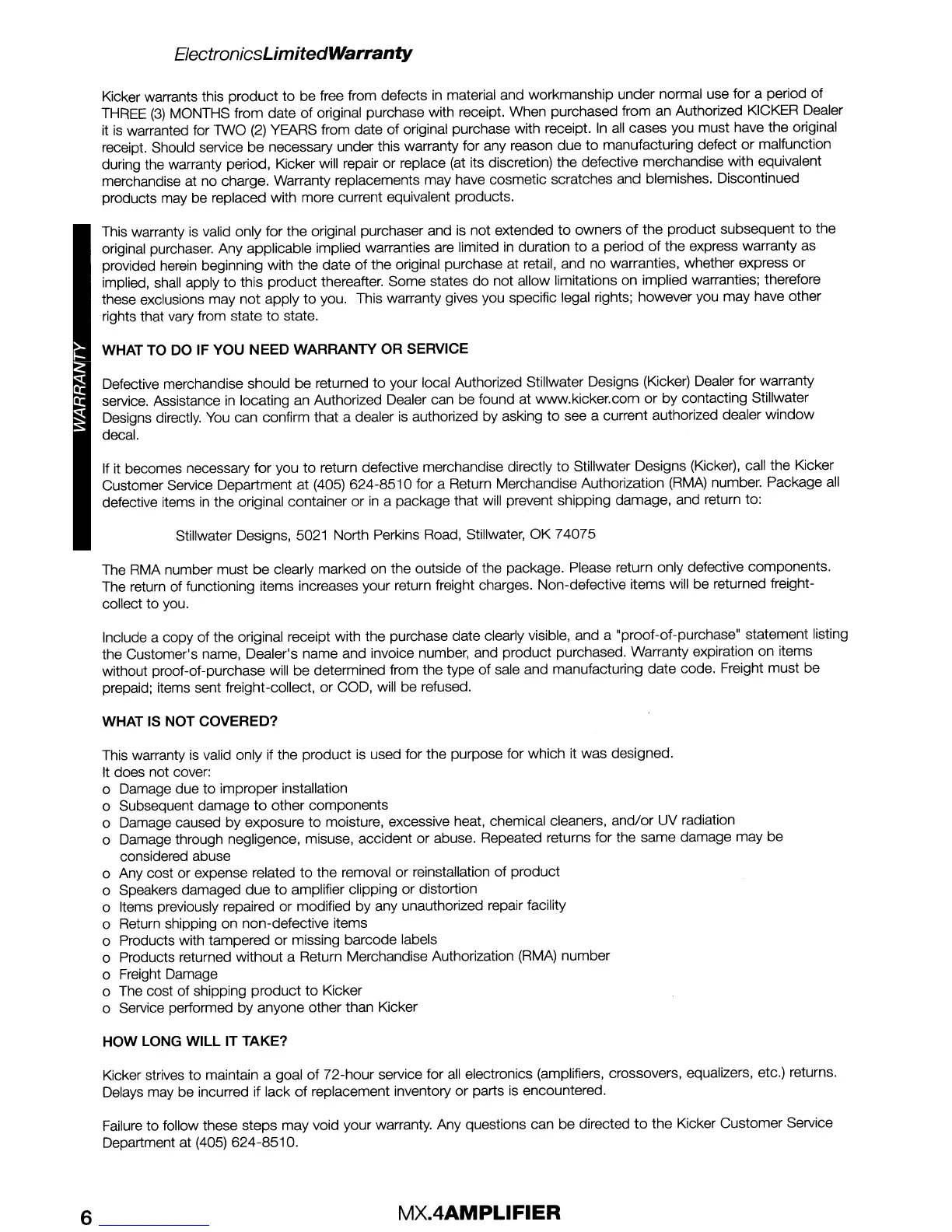 Defective merchandise should be returned to your local Authorized Stillwater Designs (Kicker) Dealer for warranty