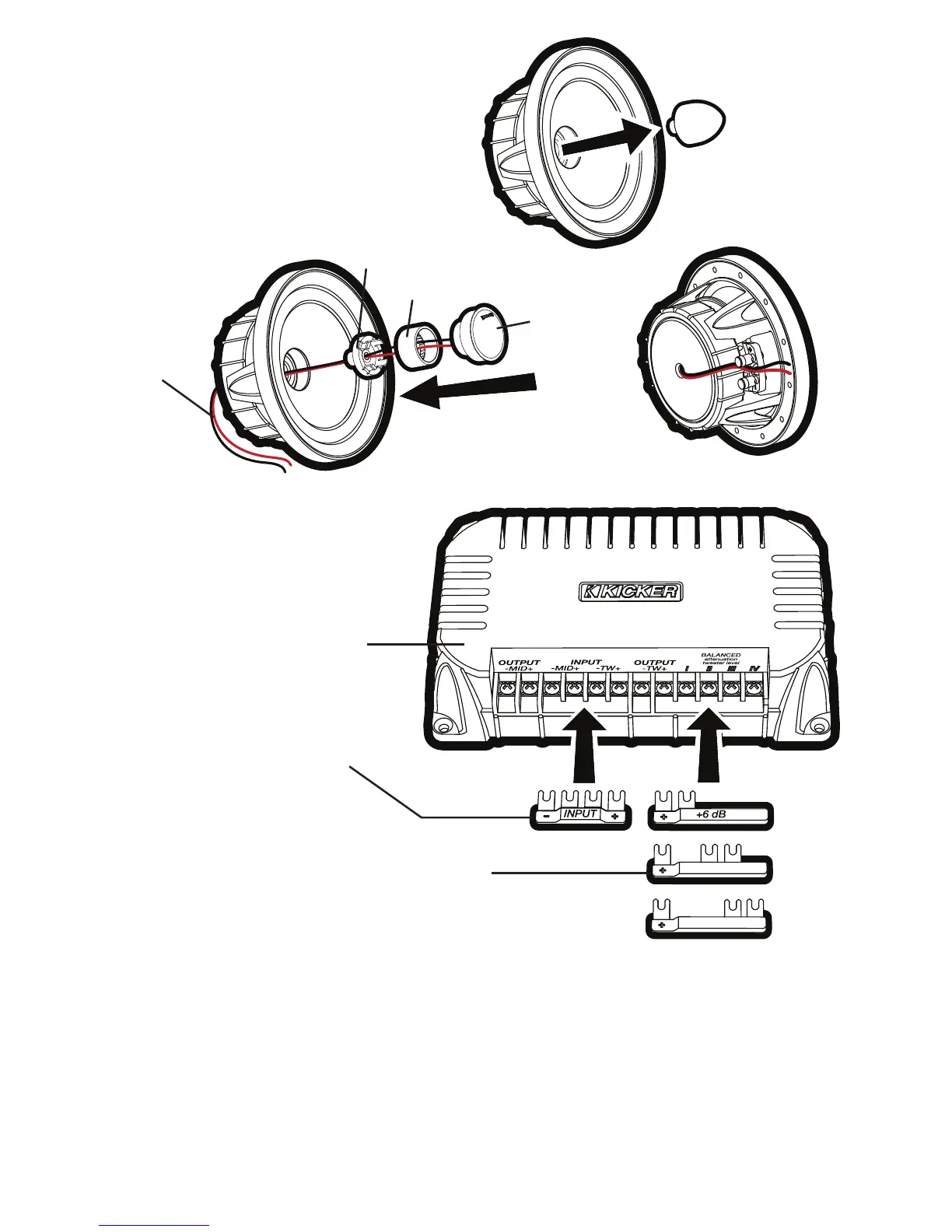 the amplifi ed signal from your source unit or amplifi er should be wired to the + and - terminals indicated on