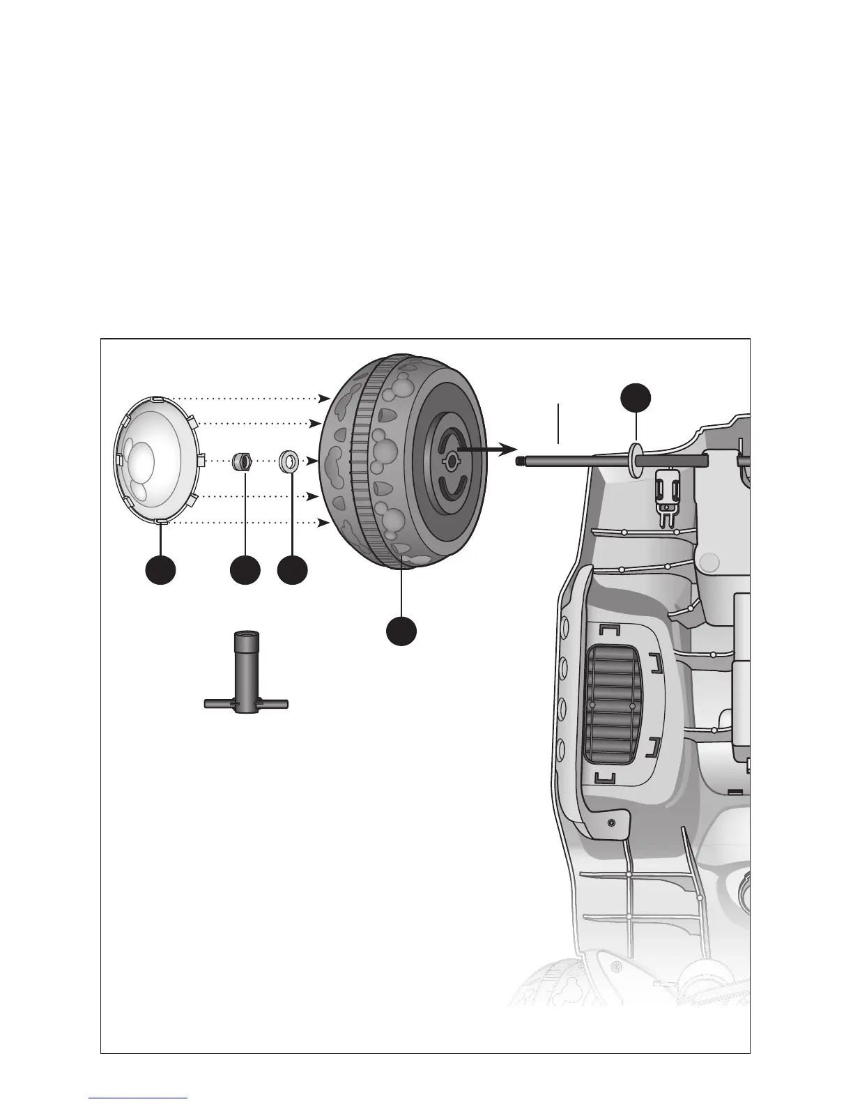Slide the wheel all the way onto the axle unl it meets the large washer. All