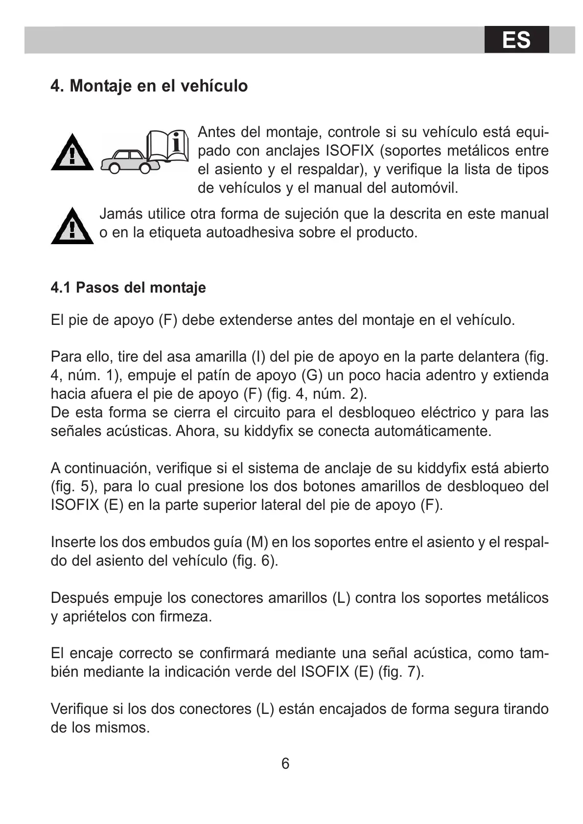 ISOFIX (E) en la parte superior lateral del pie de apoyo (F).