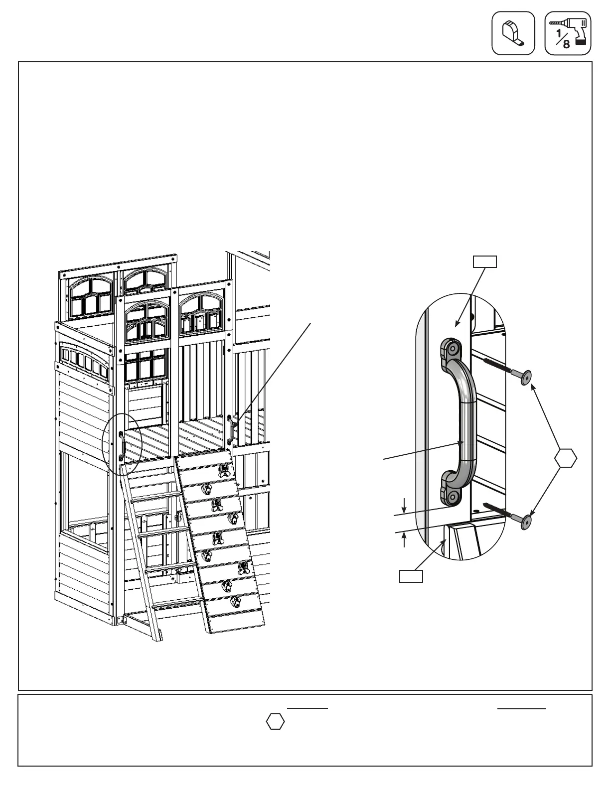 below. Pre-drill with a 1/8” drill bit then attach 2 Hand Grips using 2 (WL3) 1/4 x 1-3/8” Wafer Lag per Hand