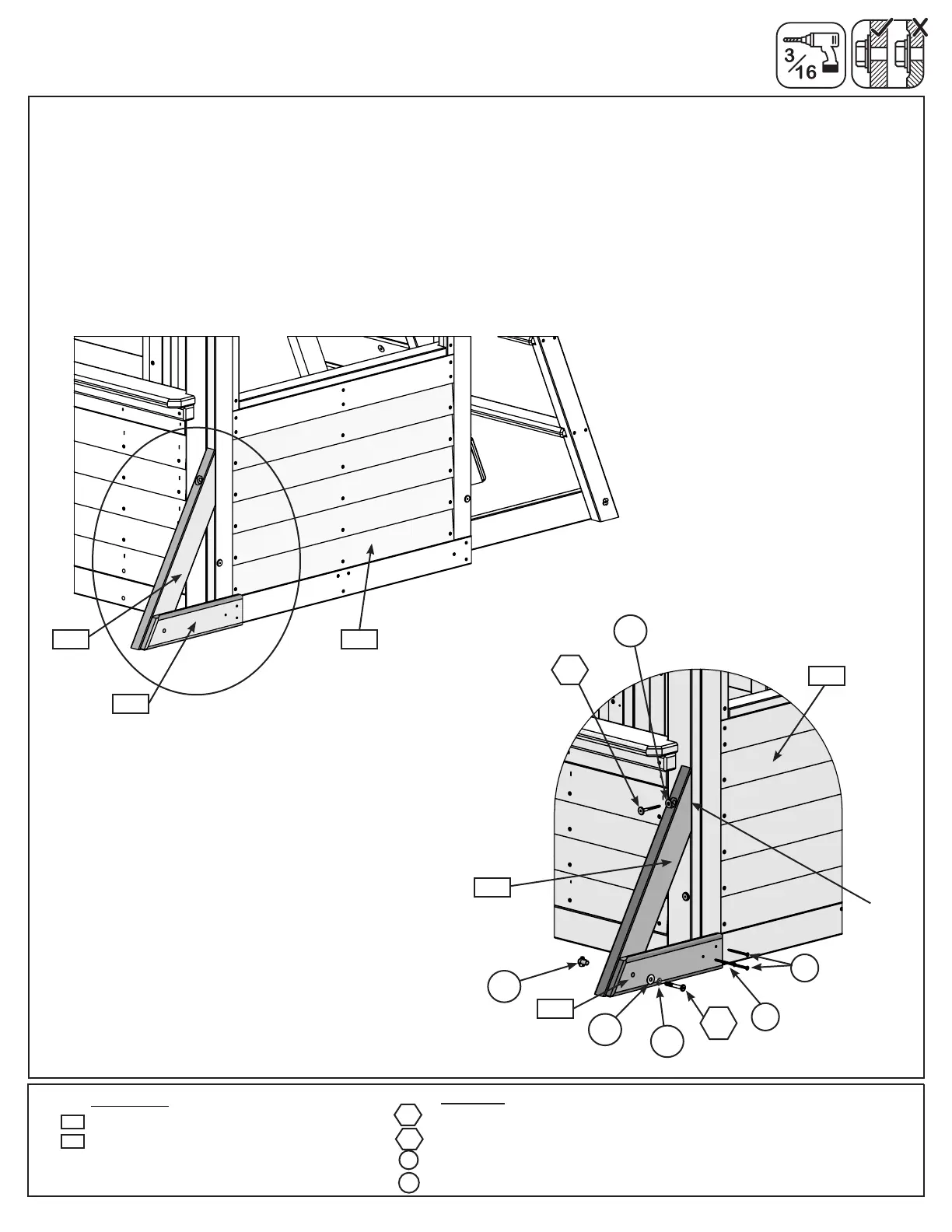 B: Pre-drill pilot hole with a 3/16” drill bit then attach (2607) Diagonal to (9213) SW Wall Panel with 1 (WL5) 1/4
