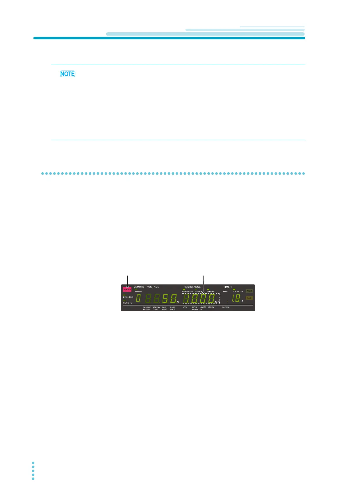 • When the test starts, the DANGER lamp lights up, the voltmeter and resistance meter