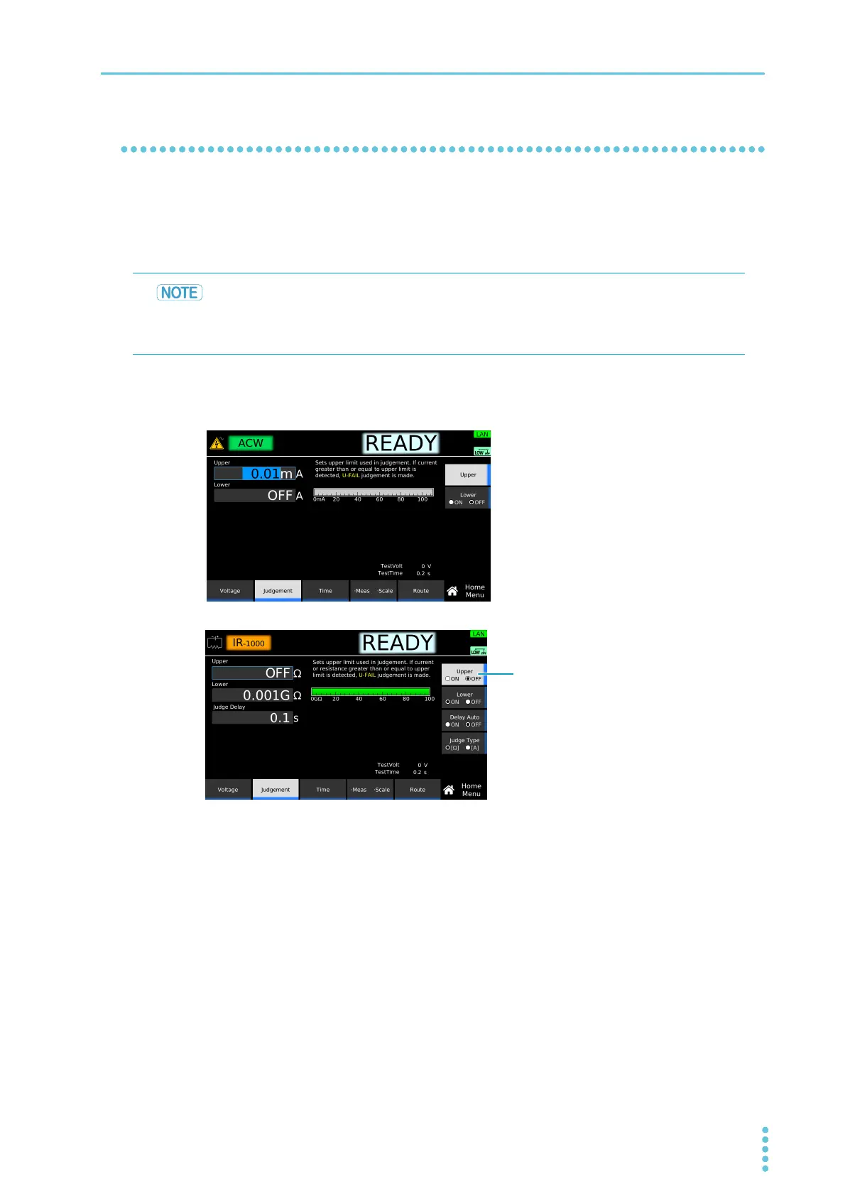 measured, upper limit judgment (U-FAIL) results. In insulation resistance (IR) tests, you can set Upper to