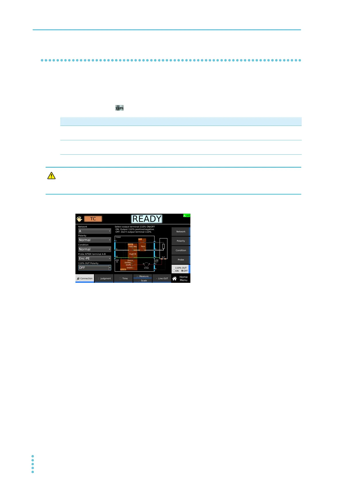 Risk of electric shock. If you set 110% OUT to ON, do not touch the tip of the test lead