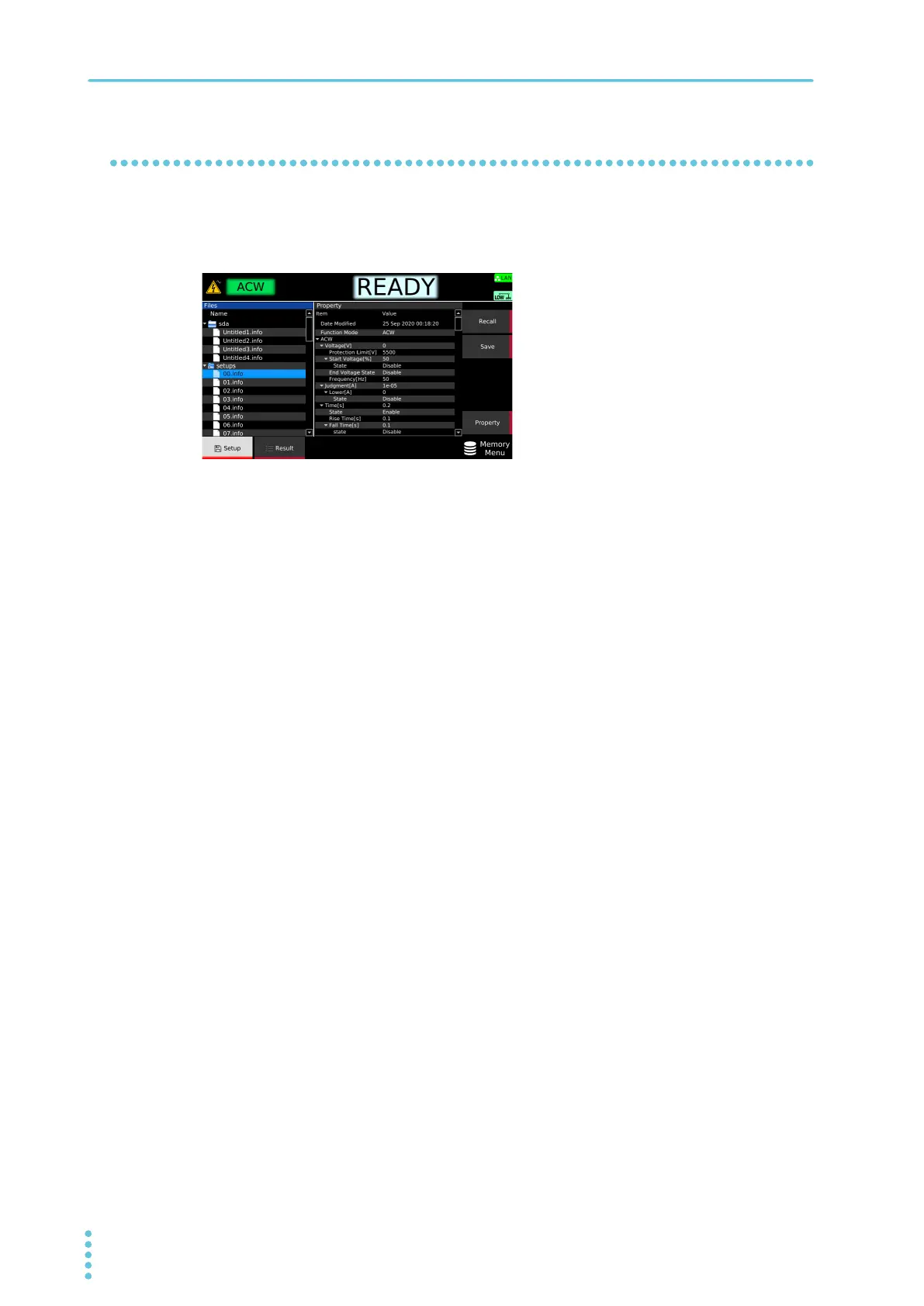 Press Property to view the settings of the setup memory on the right side of the display. Press