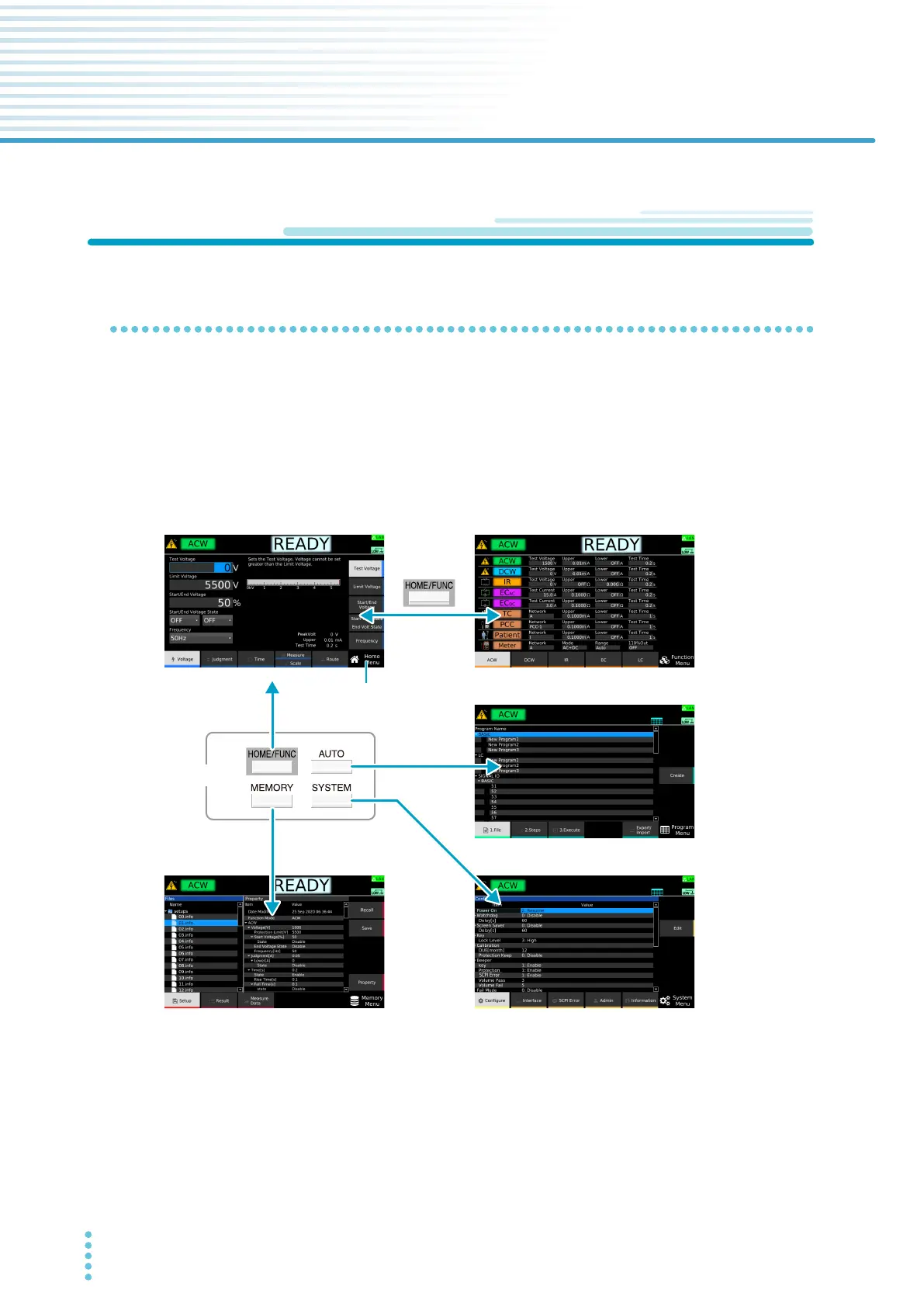 Function Menu: Display a summary of settings of each test. Swit