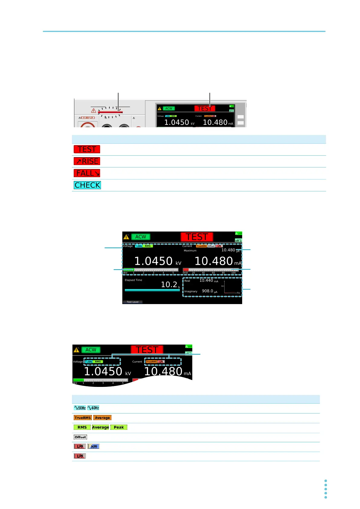 During a test, the DANGER LED lights, and the test status is shown in the upper right of the display. The