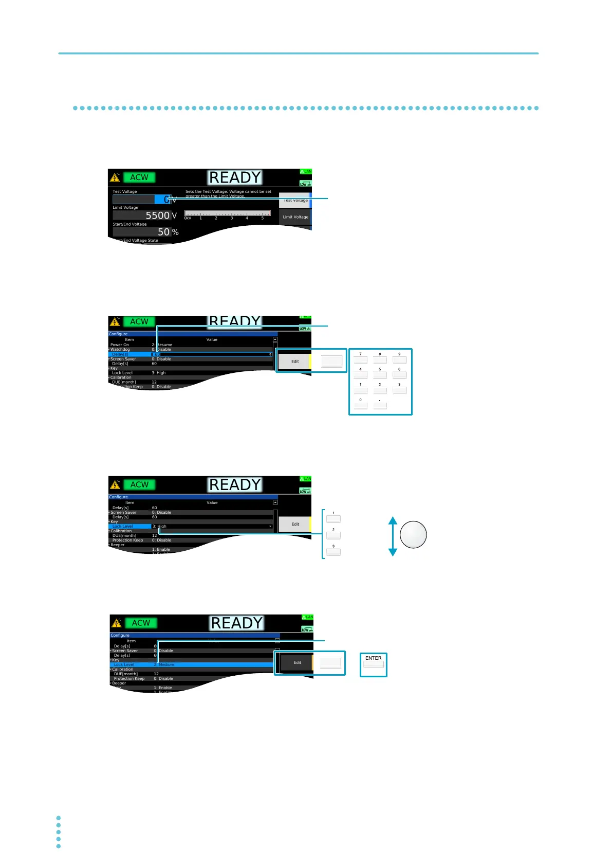 To change the test voltage or other values, use the numeric keypad or the rotary knob. If you enter a value
