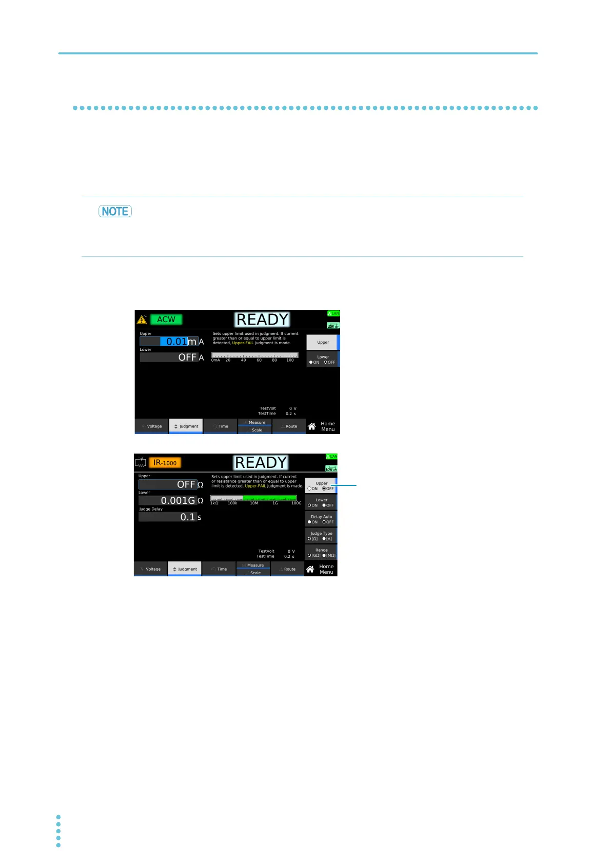 measured, upper limit judgment (Upper-FAIL) results. In insulation resistance (IR) tests, you can set Upper