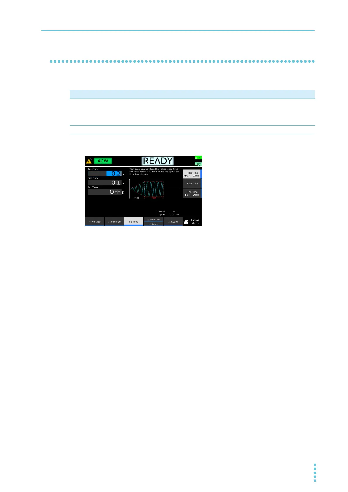 ON Set the time from when the Voltage rise time (p.66) has passed to the end of the test. If upper